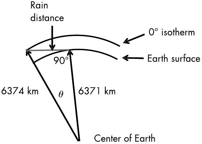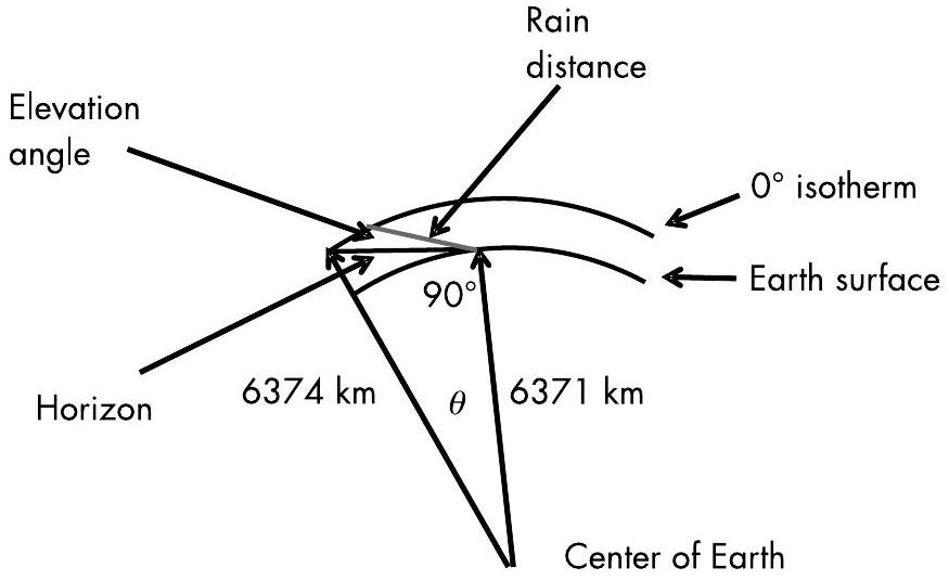 已知 \(0^{\circ}\) 等温线(0° isotherm)预期位于 3 km 高度。穿越降雨区的距离即为从地面到信号路径距离地表 3 km 处的路径长度,如图 9.11 所示。此时的地心角(geocentric angle)\((\theta)\) 为: