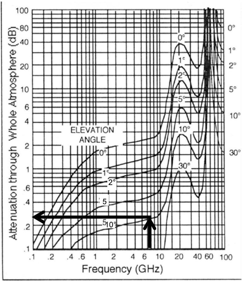 图 9.3 在 6 GHz 频率下,仰角为 \(7.8^{\circ}\) 时,大气衰减为 0.25 dB。