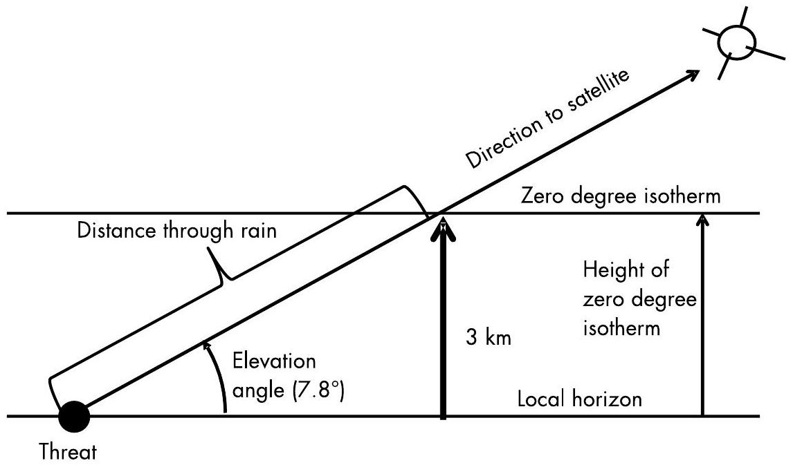 图9.23 穿越降雨区的距离为从地面到信号路径与卫星连线穿过0°C等温层(\(0^{\circ}\) isotherm)处的长度。