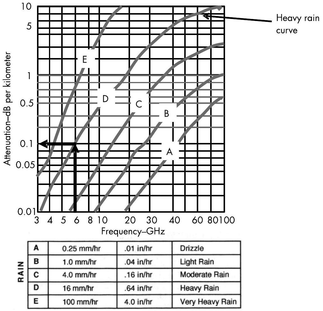 图 9.7 在 6 GHz 频率下,强降雨引起的损耗为 \(0.1 \mathrm{~dB} / \mathrm{km}\)。