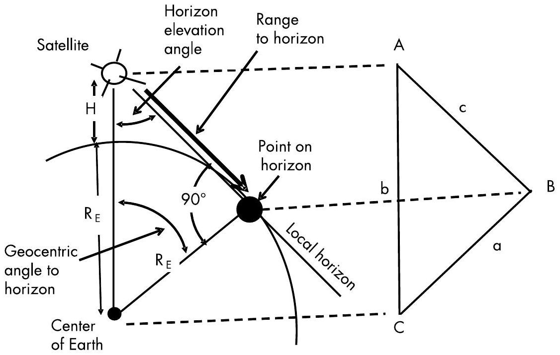 图 9.9 卫星到地平线的距离以及指向地平线的地心角(geocentric angle)可通过由卫星、地平点和地球中心构成的平面三角形计算得出。