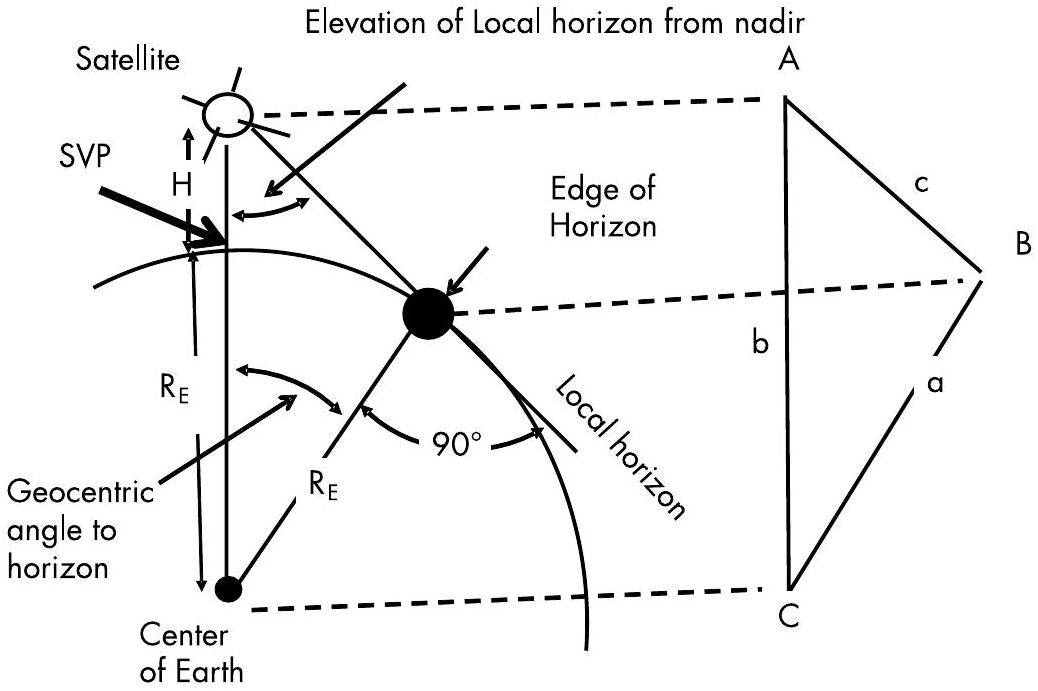 图 9.13 地平线边缘点相对于卫星 SVP 的位置由该球面三角形给出。