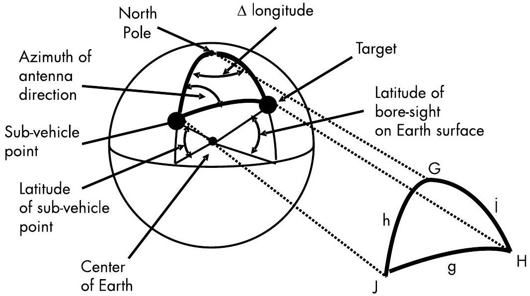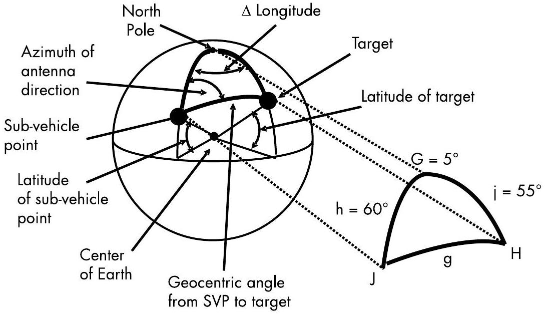 使用第 9.3.1 节中介绍的方法,我们将计算将卫星天线波束主轴指向目标发射机所需的方位角与仰角(从天底计)。首先考虑图 9.16 中由 SVP、目标点和北极构成的球面三角形。这与图 9.14 的结构相同,但使用了当前问题中的实际参数: