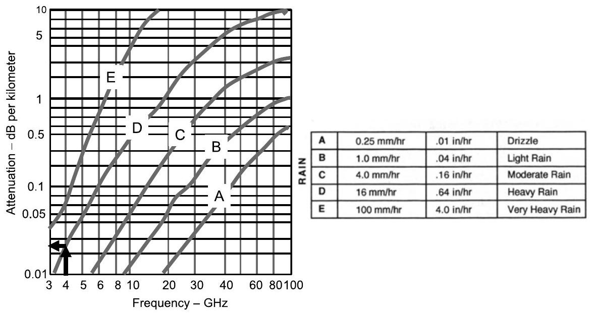 图 9.20 在 4 GHz 频率下,强降雨引起的损耗为 \(0.02 \mathrm{~dB} / \mathrm{km}\)。