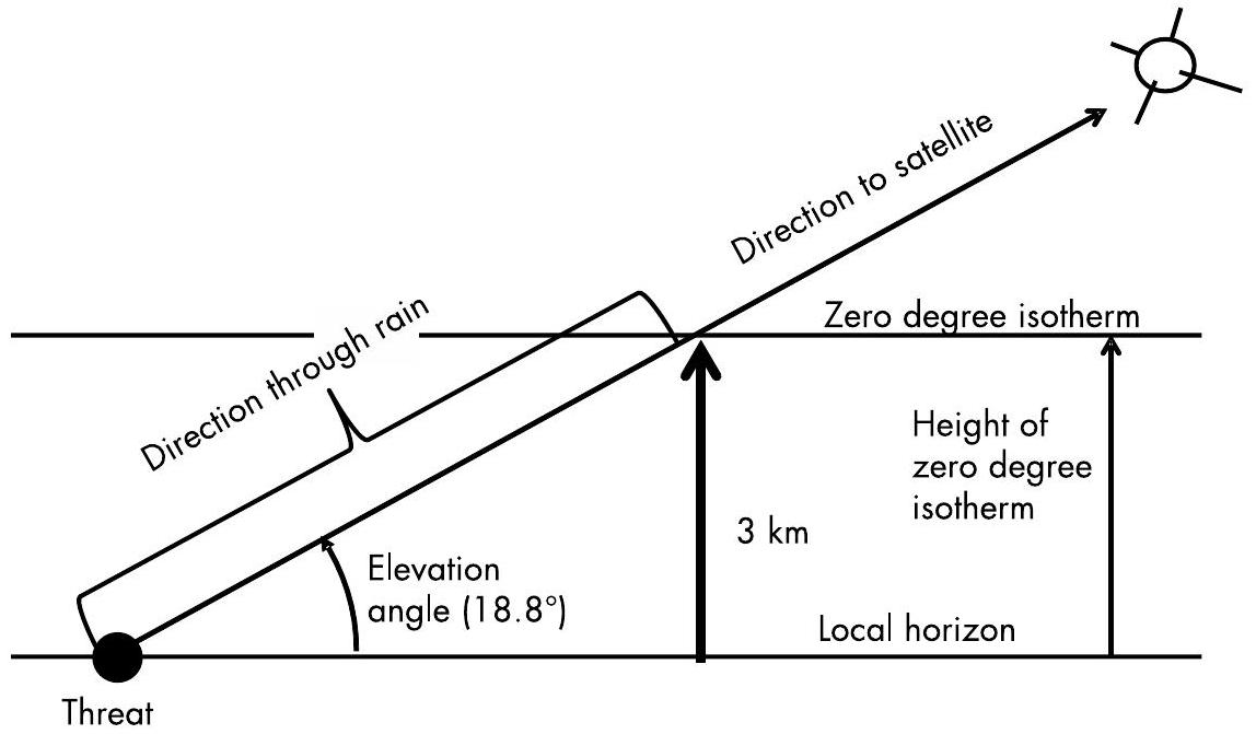 图 9.11 穿越降雨区的距离是从地面至信号路径指向卫星时穿过 \(0^{\circ}\) 等温线(0° isotherm)的点之间的距离。