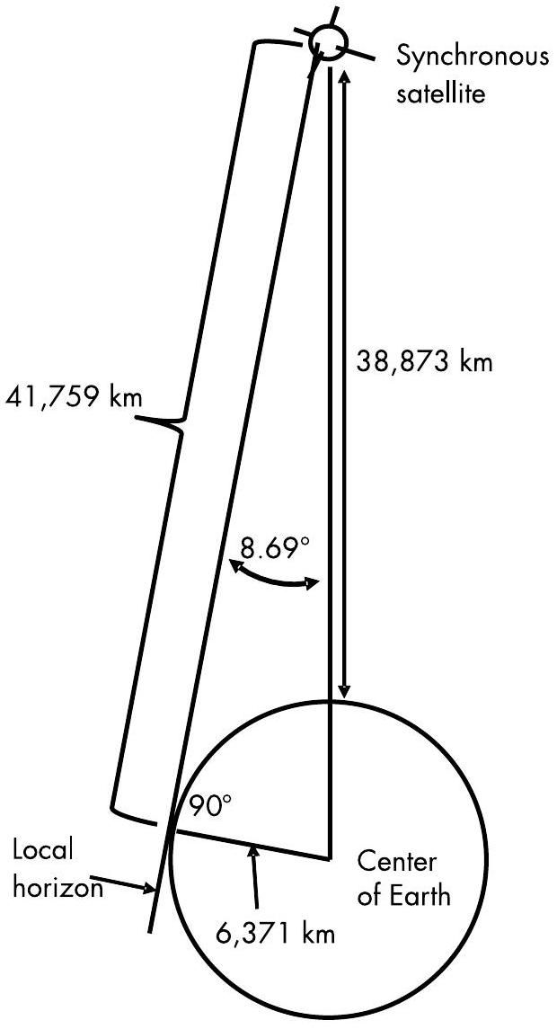 图9.24 对于位于地平线处的地球同步卫星(synchronous satellite),其距离为41,759 km;对于位于天顶正上方的同步卫星,其距离为\(35,873\ \mathrm{km}\)。