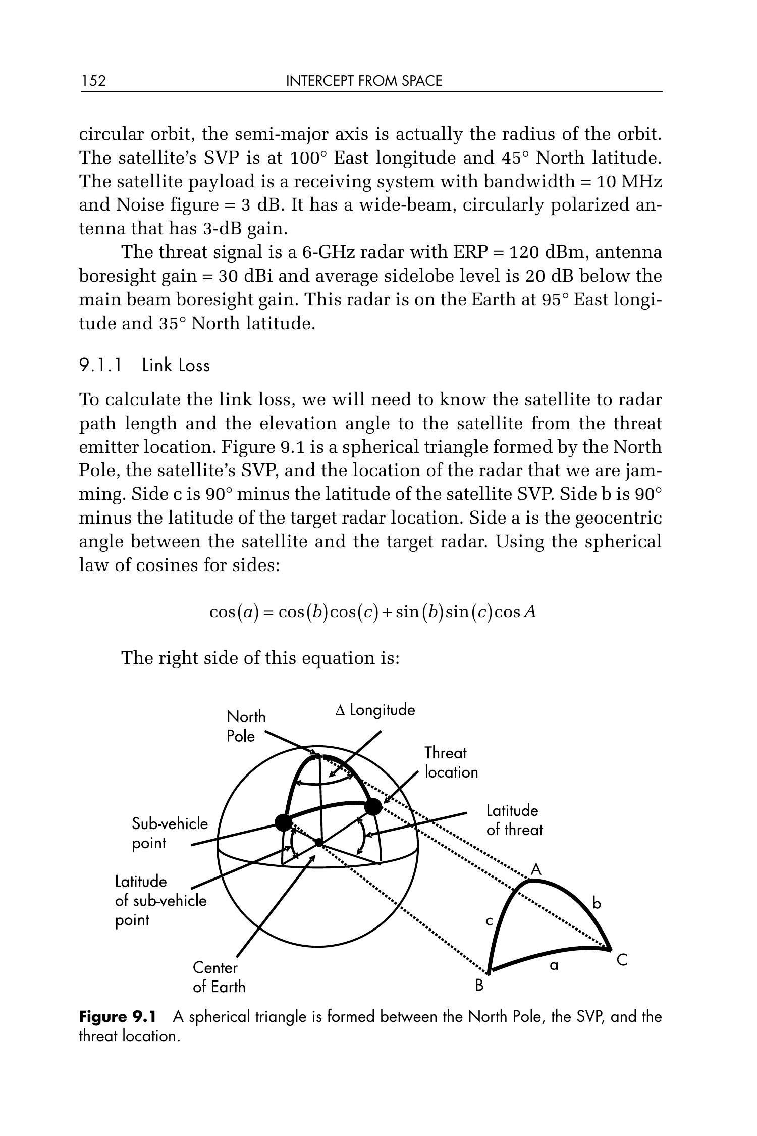 为了计算链路损耗,我们需要知道卫星到雷达之间的路径长度,以及从雷达位置看向卫星的仰角(elevation angle)。图 9.1 展示了由北极点、卫星SVP与雷达位置构成的球面三角形。三角形的边\(c\)为\(90^{\circ}\)减去卫星SVP的纬度,边\(b\)为\(90^{\circ}\)减去目标雷达位置的纬度,边\(a\)是卫星与目标雷达之间的地心角(geocentric angle)。根据球面余弦定理(Spherical Law of Cosines)可得: