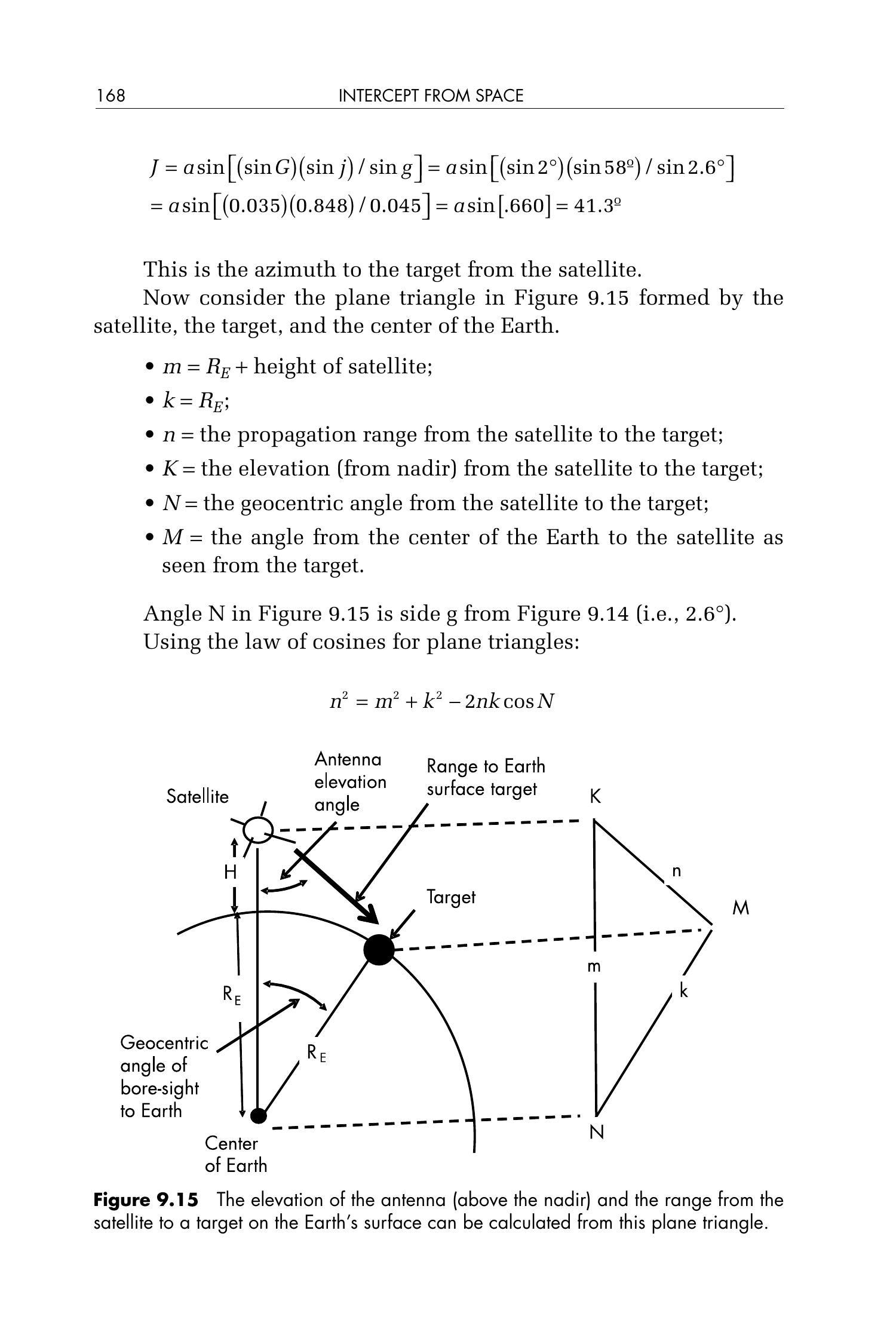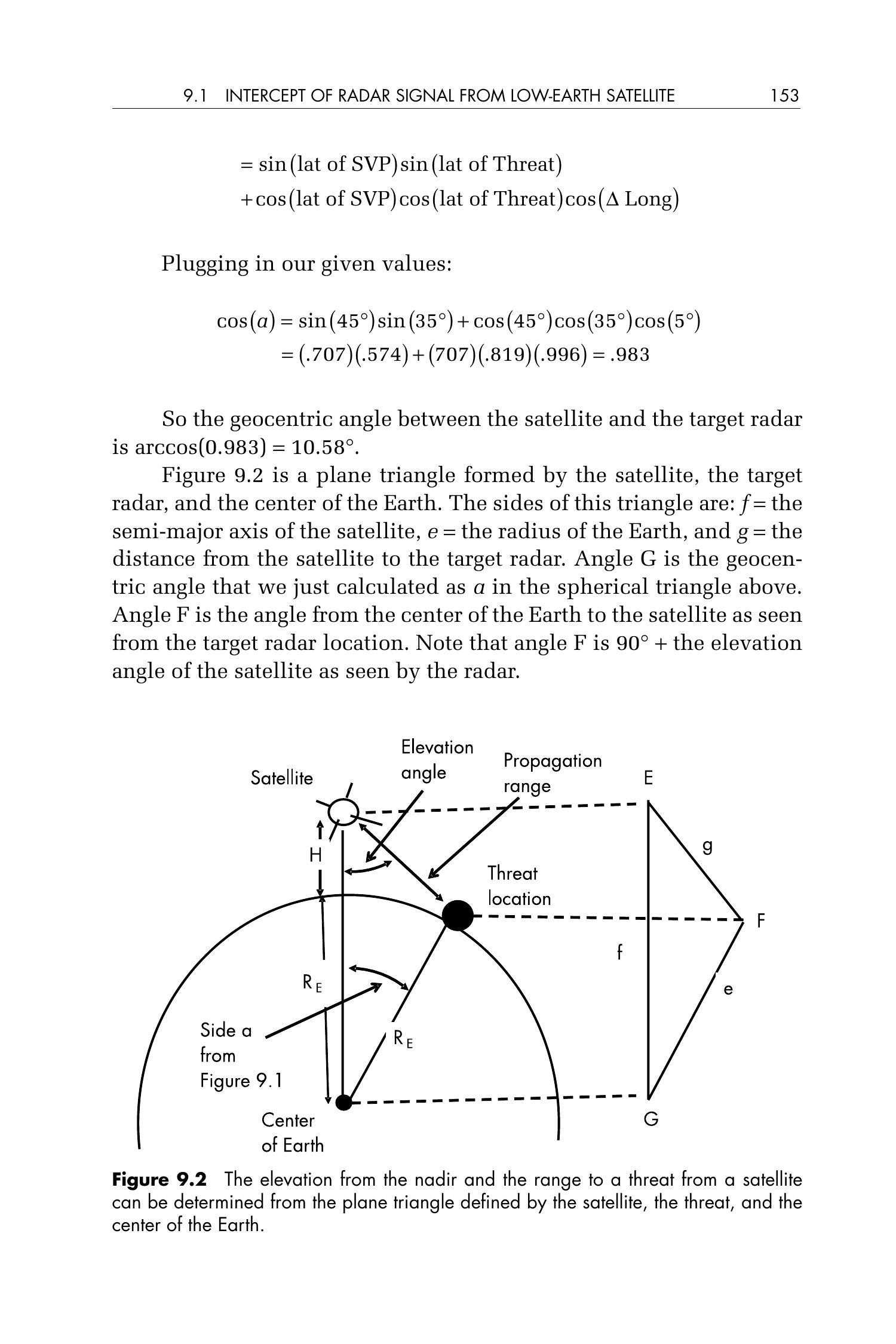 图 9.2 展示了由卫星、目标雷达与地心构成的平面三角形。该三角形的三边分别为:\(f=\) 卫星轨道半长轴,\(e=\) 地球半径,\(g=\) 卫星到目标雷达的距离。角 \(G\) 是我们刚才在球面三角中计算得到的地心角 \(a\)。角 \(F\) 是从目标雷达视角看向地球中心的夹角。注意,角 \(F\) 等于 \(90^{\circ}+\) 雷达看到的卫星仰角。