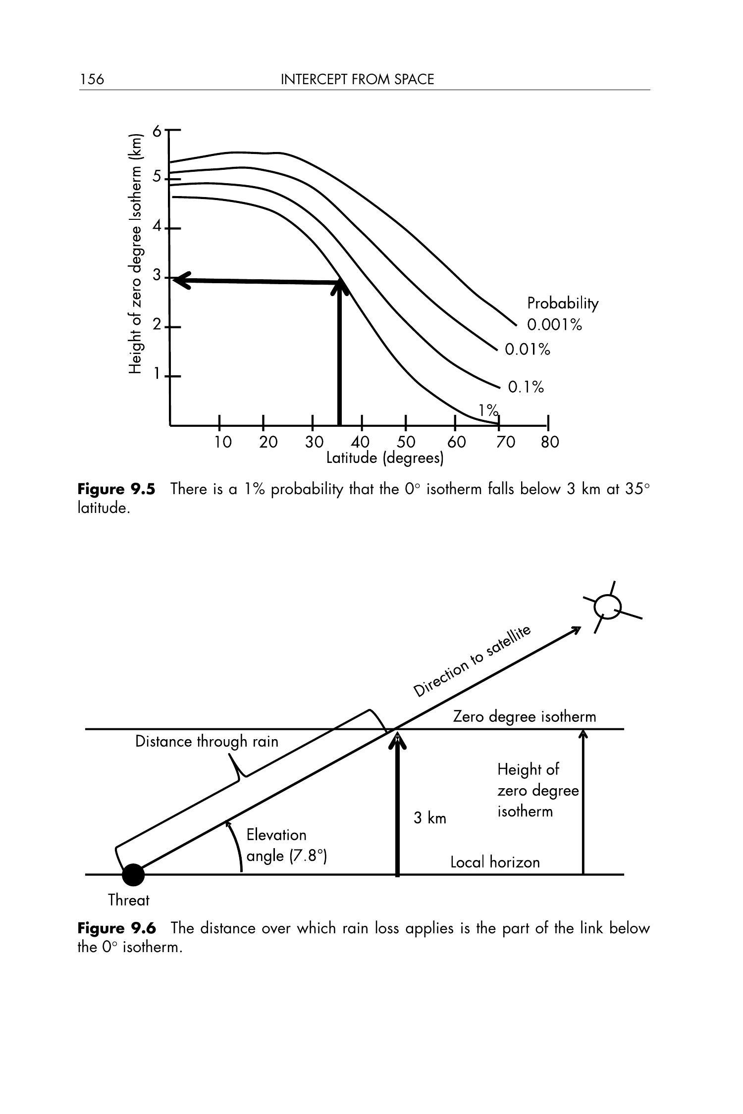 现在考虑图 9.3 中的大气损耗。从该图中可以看出,在仰角为 \(7.8^{\circ}\) 时,信号穿过整个大气层的损耗为 0.2 dB。假设我们希望在强降雨条件下截获该信号。从图 9.4 可知,信号从 \(0^{\circ}\) 等温线(isotherm)到达地面的路径都将经过雨层。在图 9.5 中可以看到,在纬度 \(35^{\circ}\) 附近,以 1% 的概率,\(0^{\circ}\) 等温线低于 3 km。由图 9.6,我们可以计算从 \(0^{\circ}\) 等温线到地面的路径长度: