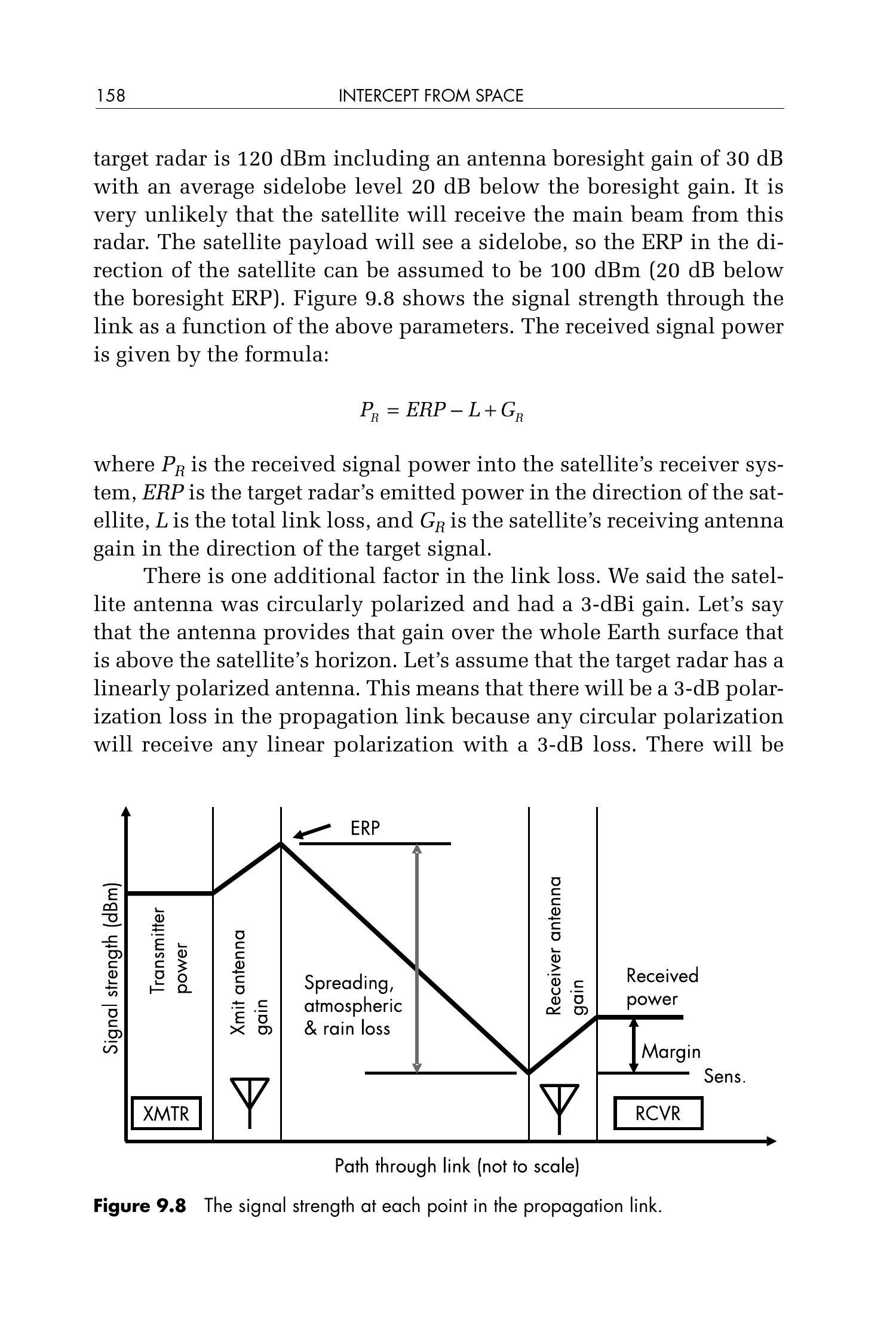 现在我们将进行一些额外的相关计算。首先,计算卫星接收到的信号强度。目标雷达的有效辐射功率(ERP, Effective Radiated Power)为 120 dBm,其中包括天线主瓣轴向增益(boresight gain)30 dB,其平均旁瓣电平(sidelobe level)比主瓣增益低 20 dB。卫星接收到该雷达主波束的可能性极小,卫星有效载荷将接收到一个旁瓣信号,因此可假设指向卫星方向的有效辐射功率为 100 dBm(比主瓣方向的 ERP 低 20 dB)。图 9.8 显示了在上述参数条件下链路中信号强度的变化情况。接收信号功率由以下公式给出: