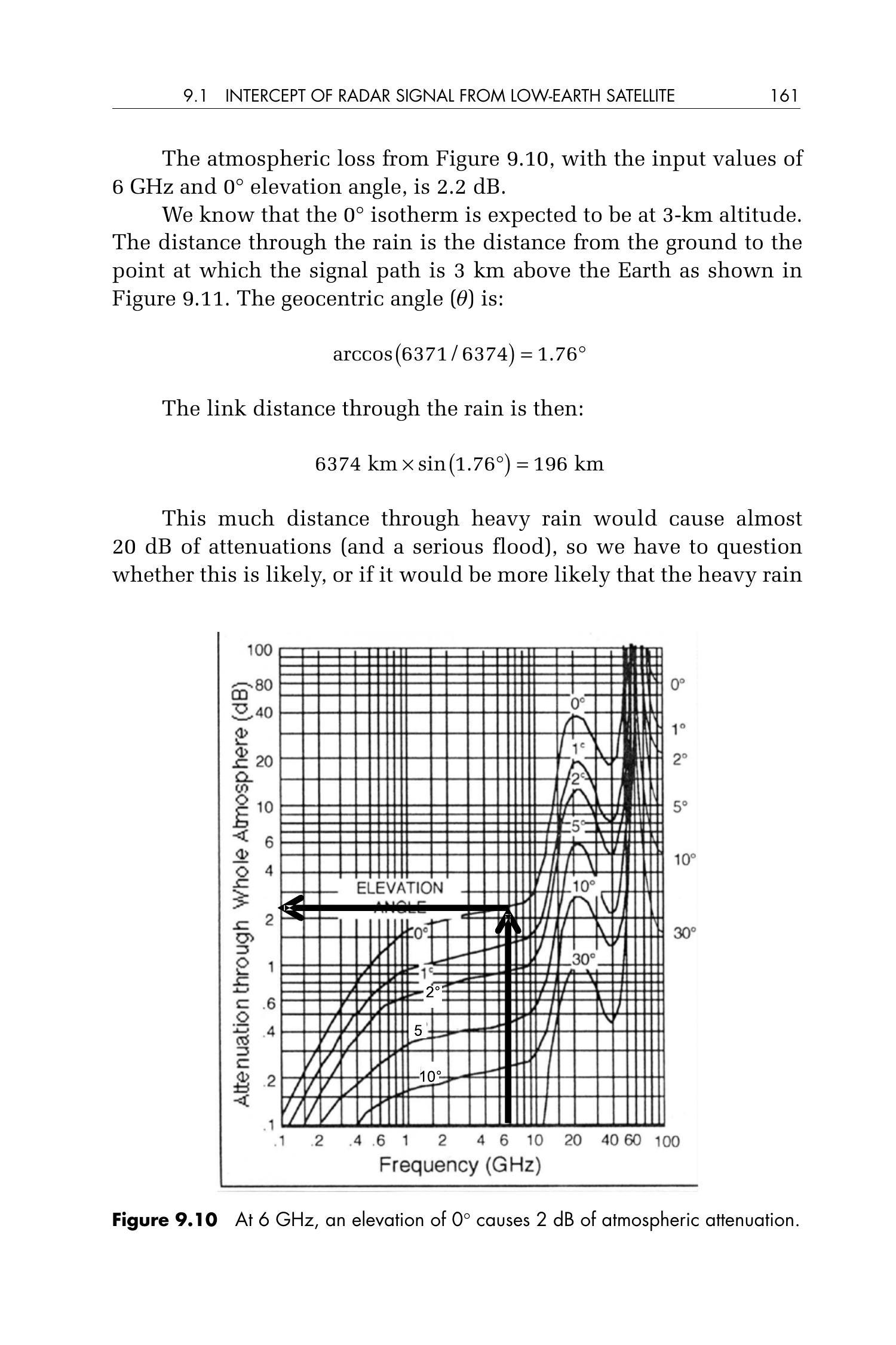 图 9.10 显示在 6 GHz、仰角 \(0^{\circ}\) 下的大气损耗为 2.2 dB。