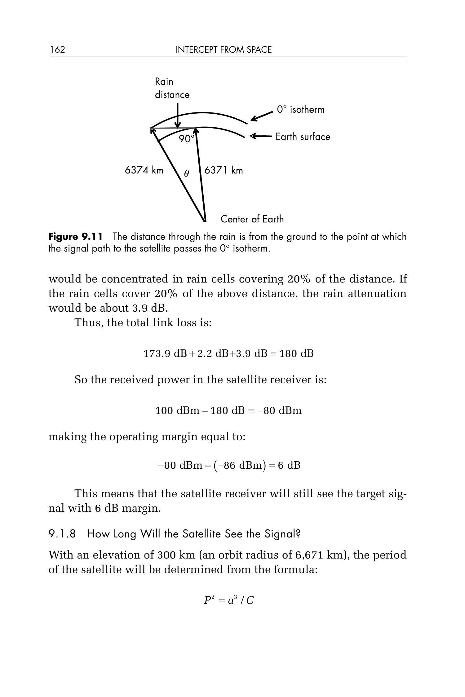 图9.23 穿越降雨区的距离为从地面到信号路径与卫星连线穿过0°C等温层(\(0^{\circ}\) isotherm)处的长度。
