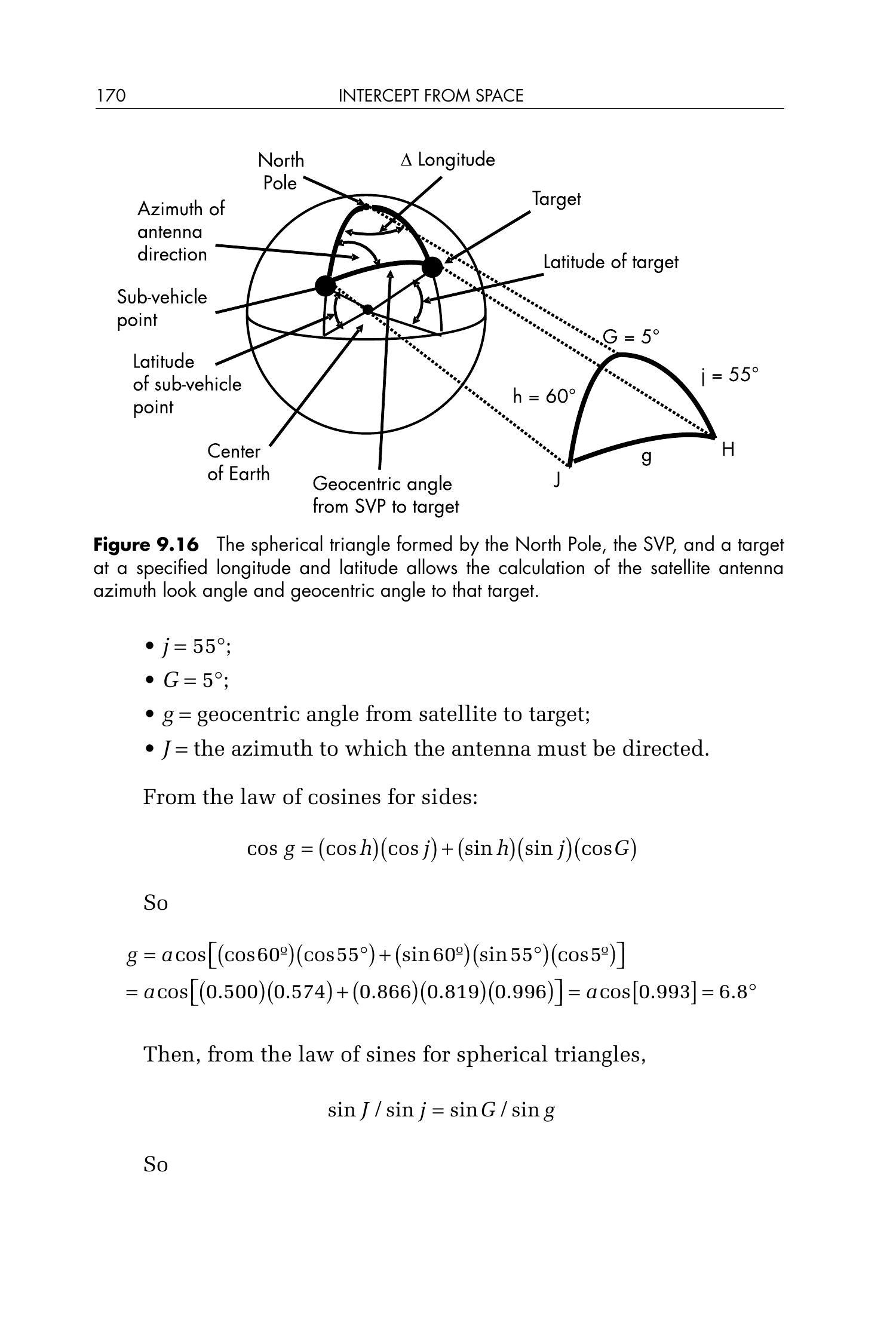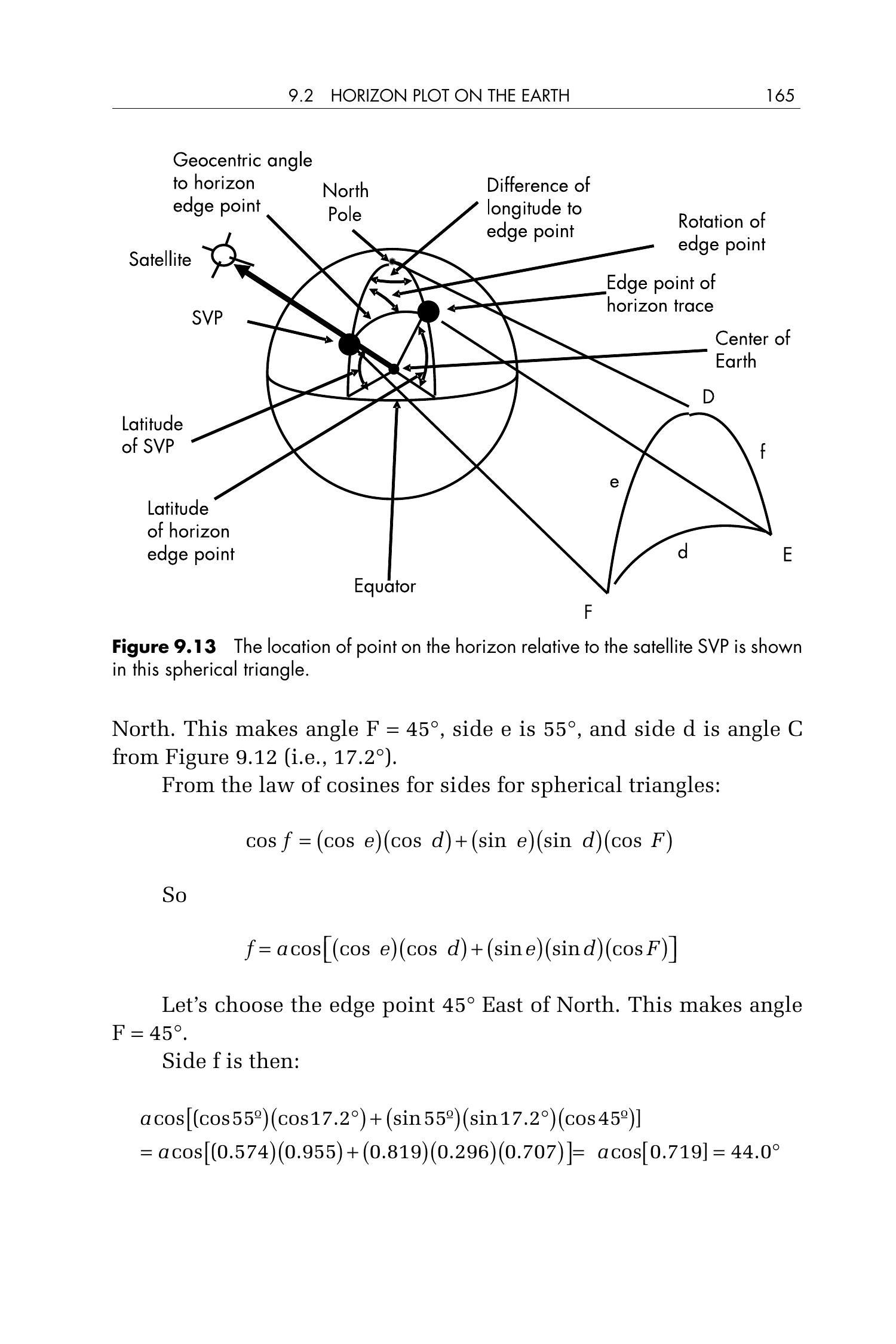 图 9.13 地平线边缘点相对于卫星 SVP 的位置由该球面三角形给出。