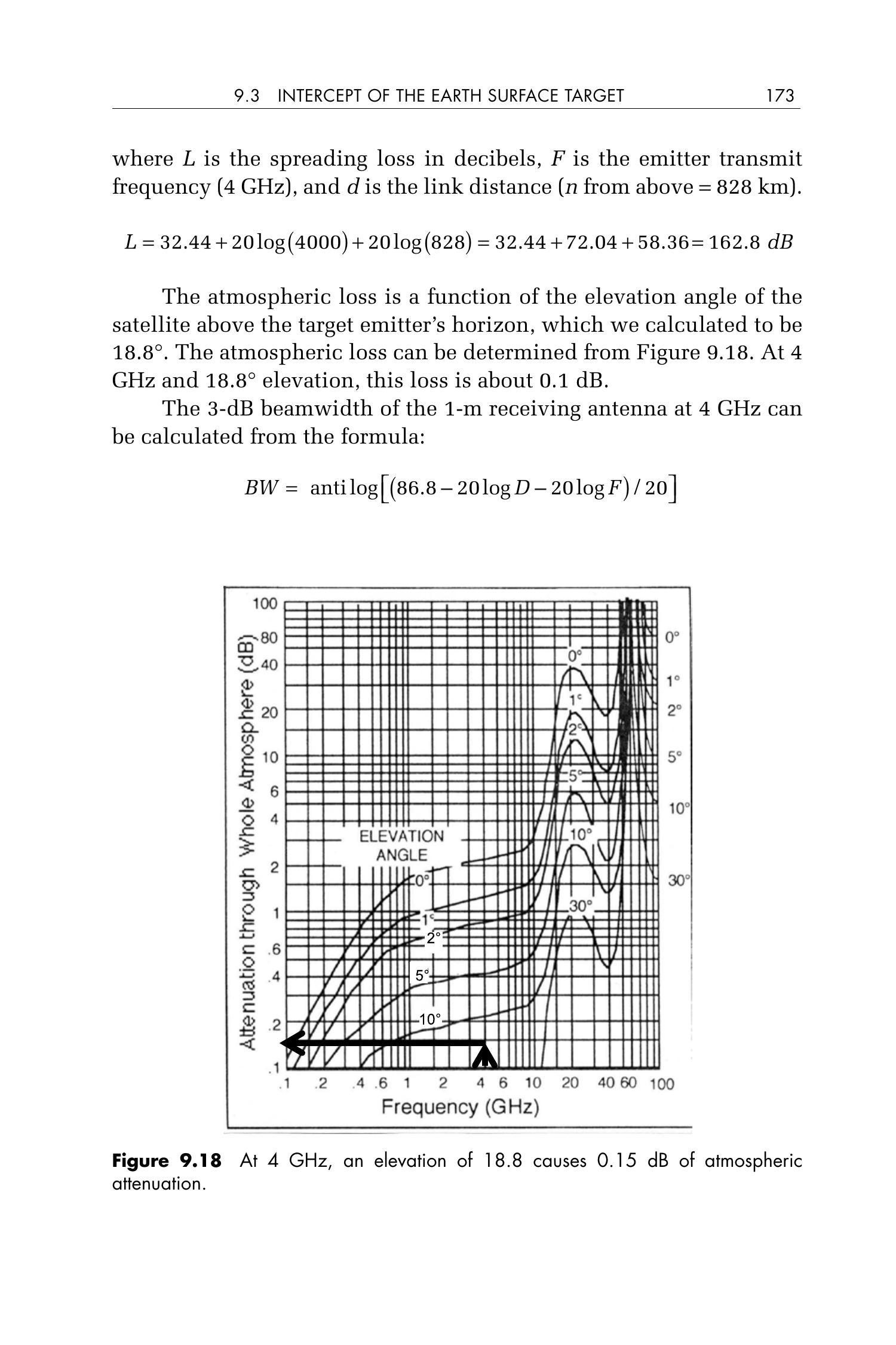 图9.18 在4 GHz频率下,18.8°仰角导致约0.15 dB的大气衰减(atmospheric attenuation)。