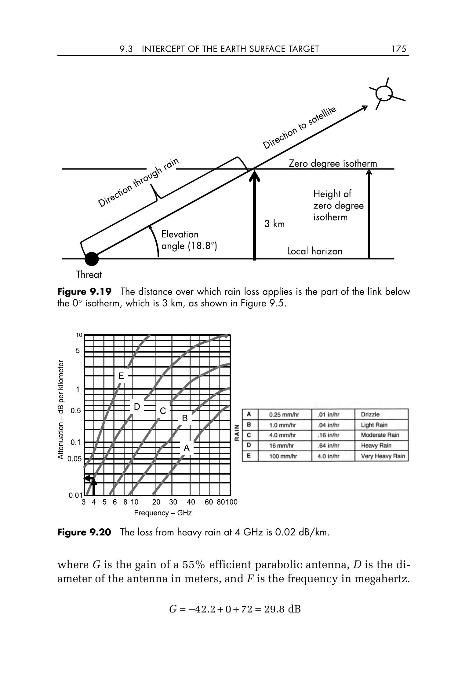 根据图9.20,4 GHz频率下的强降雨(heavy rain)损耗为 \(0.02\ \mathrm{dB} / \mathrm{km}\)。据此计算,总雨衰为 \(196 \times 0.02\ \mathrm{dB} = 4\ \mathrm{dB}\)。然而,在196 km范围内持续出现强降雨将引发严重洪灾,因此我们假设强降雨仅集中在降雨路径中20%的区域(即强降雨单元,heavy rain cells),故在链路预算中采用0.8 dB作为雨衰损耗值。
