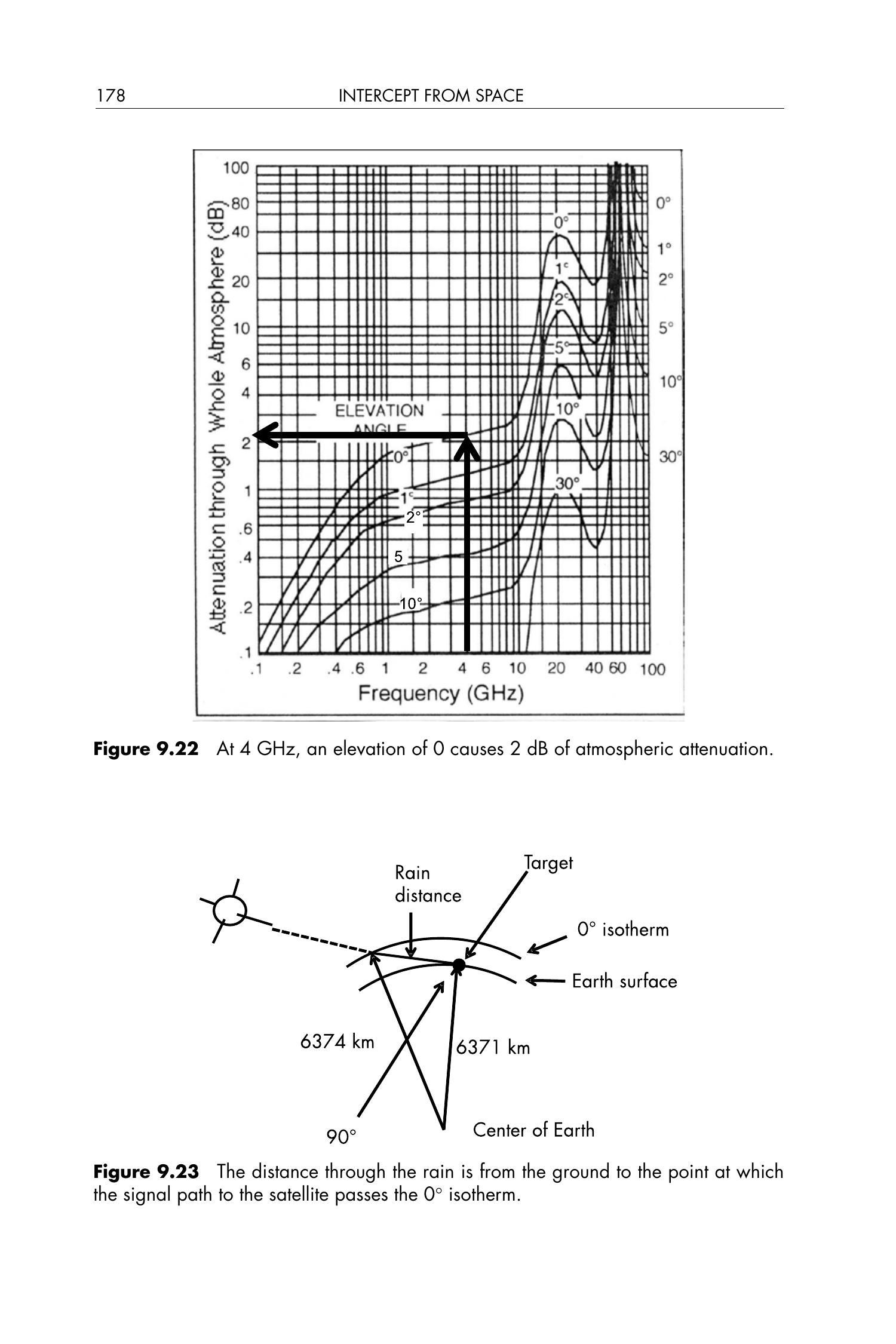 图9.22 在4 GHz频率下,0°仰角导致约2 dB的大气衰减(atmospheric attenuation)。
