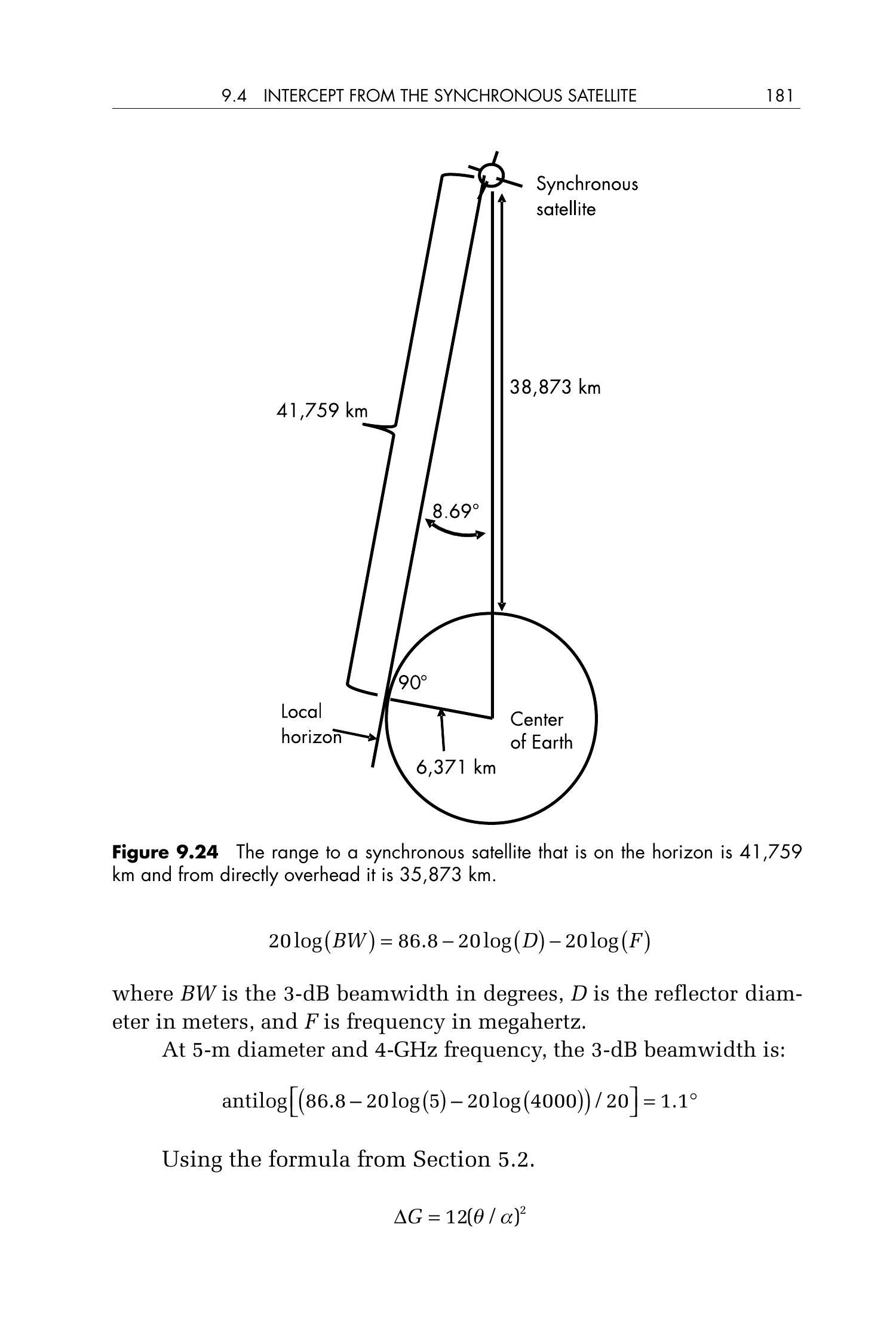 图 9.24 显示了从同步轨道卫星到地面目标的距离。如果卫星位于目标的地平线上,则距离为 \(41,759\ \mathrm{km}\);如果卫星正好位于目标上空,则距离为 \(35,873\ \mathrm{km}\)。正如我们将要计算的,这些距离下的损耗是很大的,但同步轨道卫星的优势在于它可以持续接收信号。