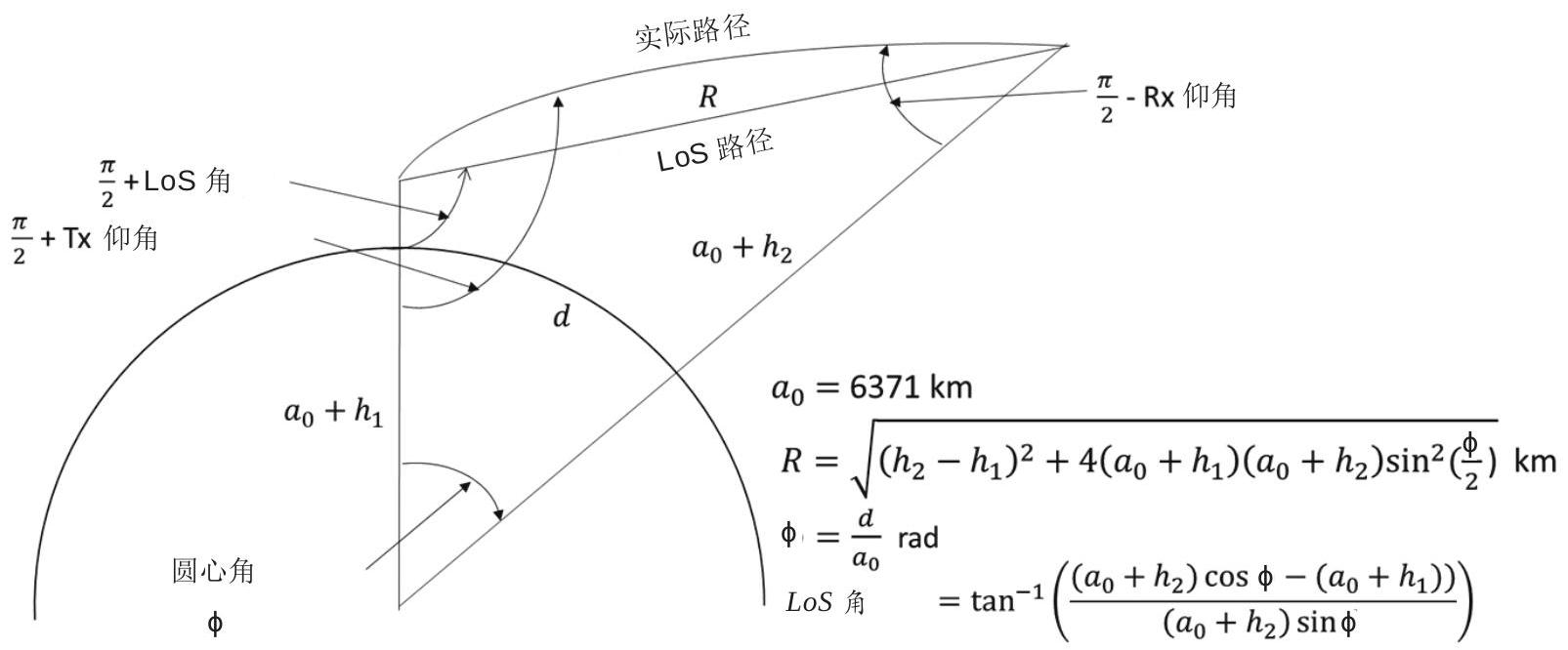 对于某些航空场景,链路几何由低终端到高终端的仰角定义(而不是终端之间的大圆距离)。因此,提供以下一组方程将自由空间仰角 \(\theta_{e l e v}\) 转换为大圆距离 \(d\) 有助于使用本建议书。