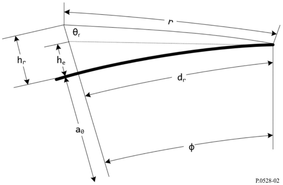 \(d_{r 1,2}\) :到终端平滑地球地平线的大圆距离 \(h_{1}\) 和 \(h_{2}\) 的弧长,单位为千米,由上述第3-1步确定;