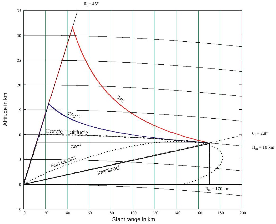 - 发射模式为 \(\csc^{2}\),接收波束服从 \(\csc^{1.5}\) 或 \(\csc\) 包络,以克服第2.2.5节所述的STC效应,同时保持上方覆盖的高度精度一致。