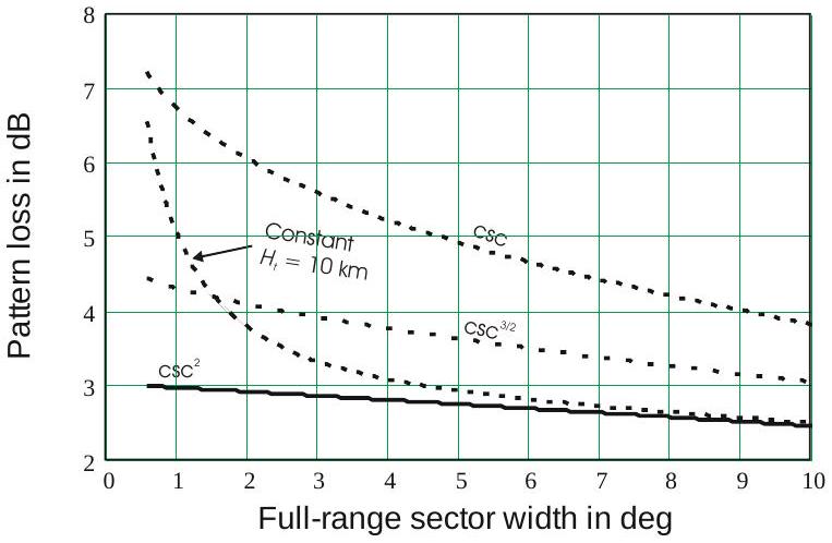 在二维监视雷达中,当采用 \(\csc^{2}\) 或恒定高度模式时,如果使用灵敏度时间控制(STC),则在应用 STC 的距离上目标的探测距离会降低。为避免这种情况,使用增强上方覆盖的天线模式 [6]。图2.1中给出了两种曲线,对应增益随 \(\csc^{3/2}\theta\) 和 \(\csc \theta\) 变化。图2.2中也绘出了这两种情况的损耗 \(L_{\text{csc}}\)。对于 \(\csc \theta\) 模式,其等效俯仰上限角为: