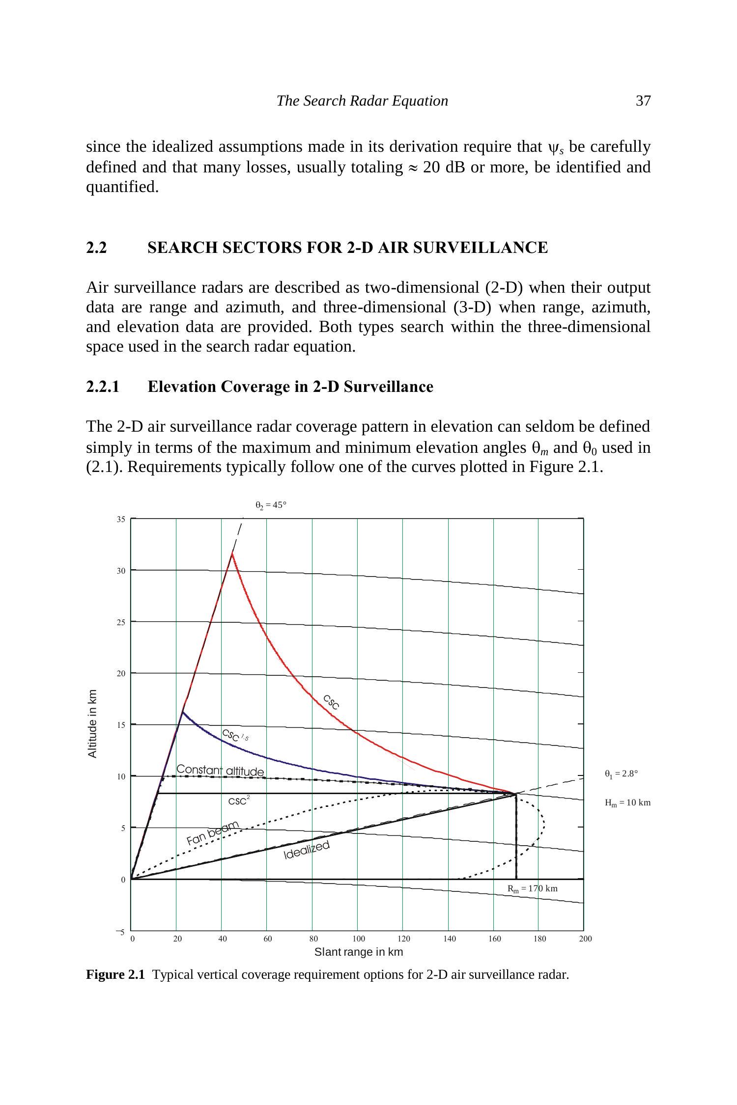 二维空中监视雷达的俯仰覆盖模式很少能简单地用式 (2.1) 中的最大和最小俯仰角 \(\theta_{m}\) 和 \(\theta_{0}\) 来定义。需求通常遵循图2.1中所绘的某一曲线。