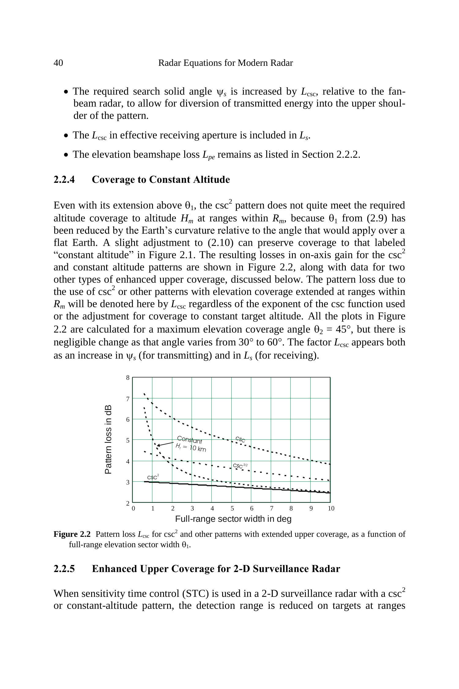 在二维监视雷达中,当采用 \(\csc^{2}\) 或恒定高度模式时,如果使用灵敏度时间控制(STC),则在应用 STC 的距离上目标的探测距离会降低。为避免这种情况,使用增强上方覆盖的天线模式 [6]。图2.1中给出了两种曲线,对应增益随 \(\csc^{3/2}\theta\) 和 \(\csc \theta\) 变化。图2.2中也绘出了这两种情况的损耗 \(L_{\text{csc}}\)。对于 \(\csc \theta\) 模式,其等效俯仰上限角为: