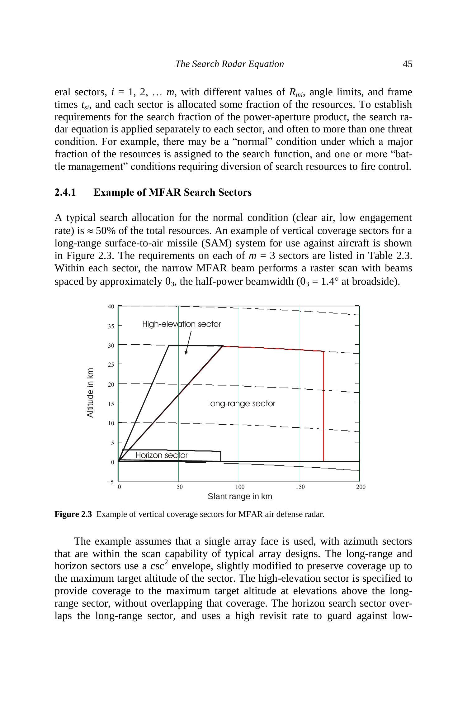在“正常”条件(晴空、低交战率)下,典型的搜索资源分配约为总资源的 \(50\%\)。图2.3给出了一个针对飞机的远程地空导弹(SAM)系统的垂直覆盖扇区示例。三个扇区的需求列于表2.3。在每个扇区内,窄MFAR波束以光栅扫描方式覆盖,波束间距约为半功率波束宽度 \(\theta_{3}\)(在正侧为 \(1.4^{\circ}\))。