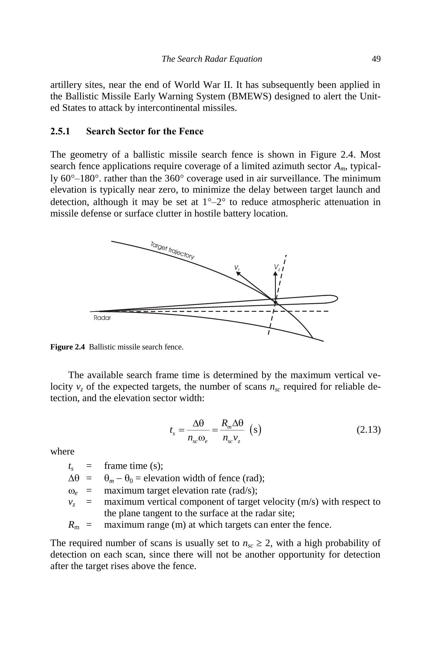 例如,假设ICBM搜索栅栏的条件如表2.6所示。目标为距雷达 \(2,600\,\mathrm{km}\) 的发射点发射的ICBM,雷达部署在防御区与发射点之间的中点。