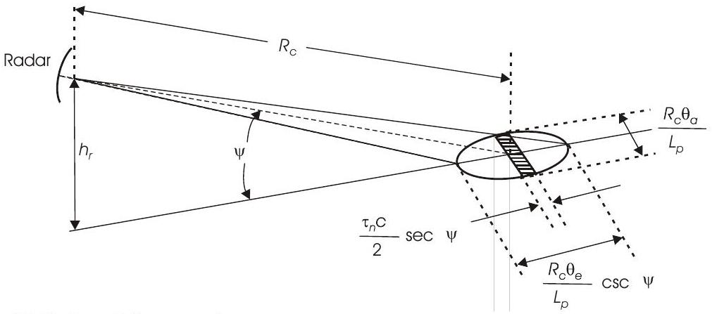 该杂波单元在方位方向的宽度由距离 \(R_{c}\) 与方位波束宽度 \(\theta_{a}\) 决定;其“深度”(距离维)通常由距离分辨力 \(\Delta_{r}\) 决定:\({ }^{2}\)