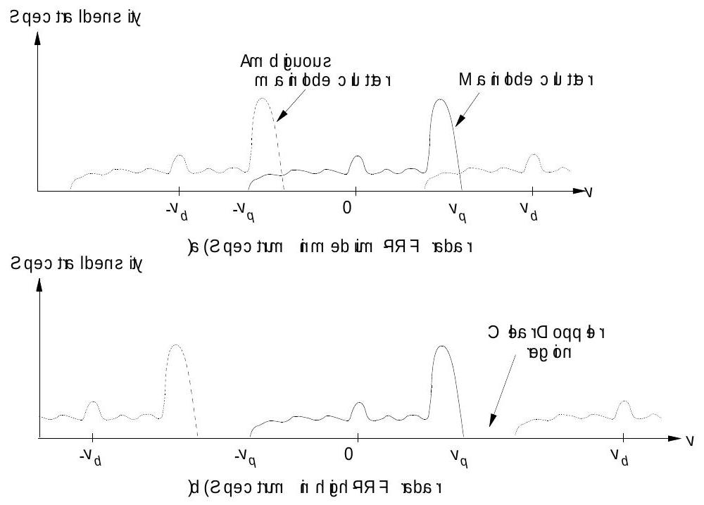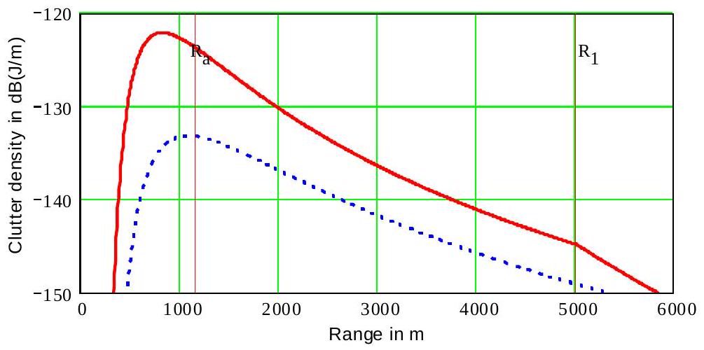 当感兴趣目标处于无模糊距离内时,杂波可能来自该范围之外(\(i>0\))。来自每个模糊区域的能量,相对目标距离 \(R\) 的杂波,要乘以因子 \(\left(R / R_{c i}\right)^{4}=R^{4}/\left(R+i R_{u}\right)^{4}\),因此即使 \(i>0\) 时也可能对干扰有贡献,尤其是在未通过杂波改进因子降低的情况下。
