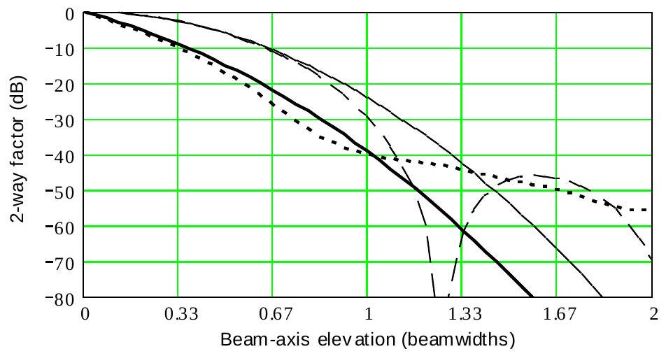 \({ }^{1}\) 用于杂波方程的波束形状损失取 \(L_{p}=1.33\),该值是对双程方向图 (5.1) 进行积分、在密集采样条件下得到的,并记作 \(L_{p0}\)(见5.2.3节)。此处附加下标 \({ }_{0}\) 用于区分该“密集采样”值与适用于一般情况下(可能包含稀疏采样、详见第5章)的目标 \(L_{p}\)。为简洁起见,本章公式中省略下标 \({ }_{0}\)。
