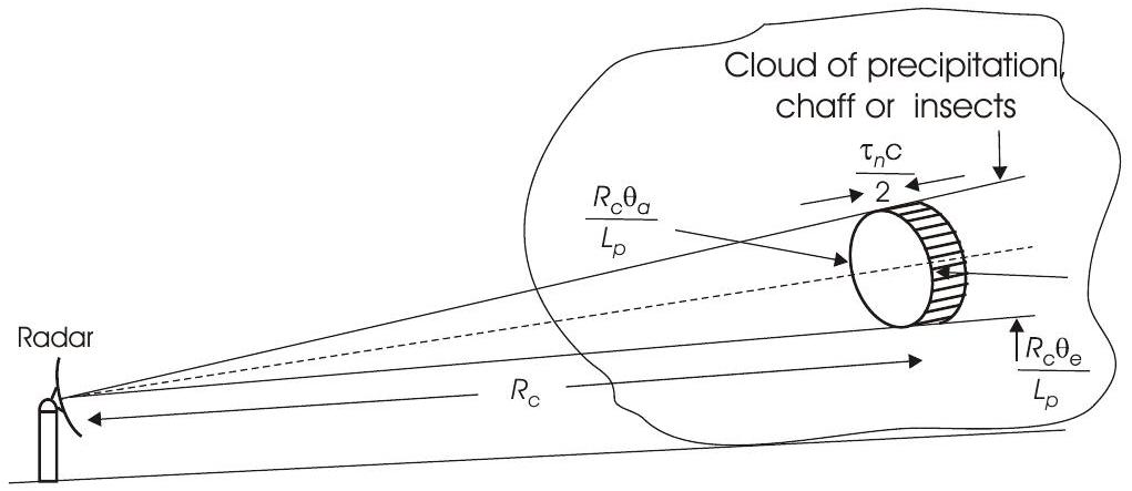 杂波单元位于由俯仰波束宽度 \(\theta_{e}\) 和方位波束宽度 \(\theta_{a}\) 确定的椭圆形波束落区内;为计及离轴散射体的双程天线增益降低,每一方向上均以波束形状损失 \(L_{p}\) 进行修正。\({ }^{1}\) 旁瓣杂波通常要小得多,可忽略不计,但将在3.6节讨论。