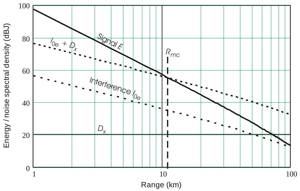 图解法:分别绘制来自公式 (1.25) 的信号能量 \(E\) 与所需能量 \(I_{0 e} D_{x}(n^{\prime})=\left(N_{0}+C_{0 e}\right) D_{x}(n^{\prime})\) 随目标距离 \(R\) 的函数曲线。若 \(E \geq I_{0 e} D_{x}(n^{\prime})\),则满足检测条件,其中最长的距离即为 \(R_{mc}\)。