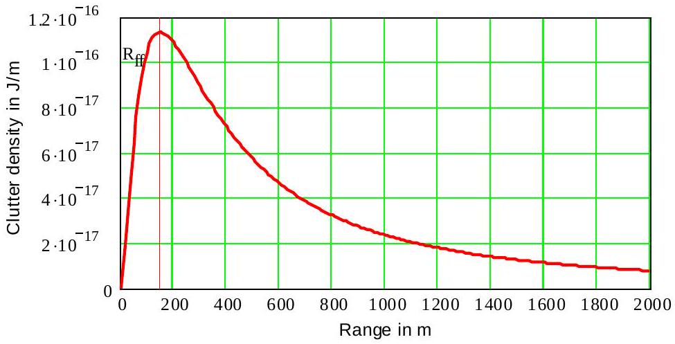 由公式 (3.11) 给出的有效杂波能量与噪声谱密度 \(N_{0}\) 相加,得到在杂波与噪声环境下的有效干扰能量 \(I_{0 e}\)。由此可得在杂波条件下的检测距离 \(R_{mc}\):