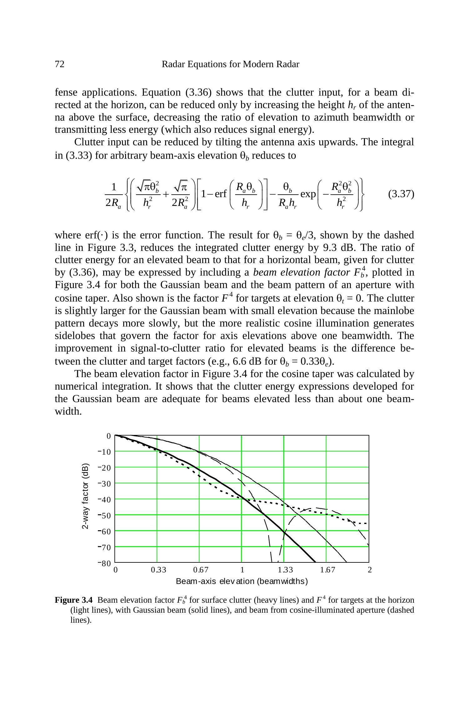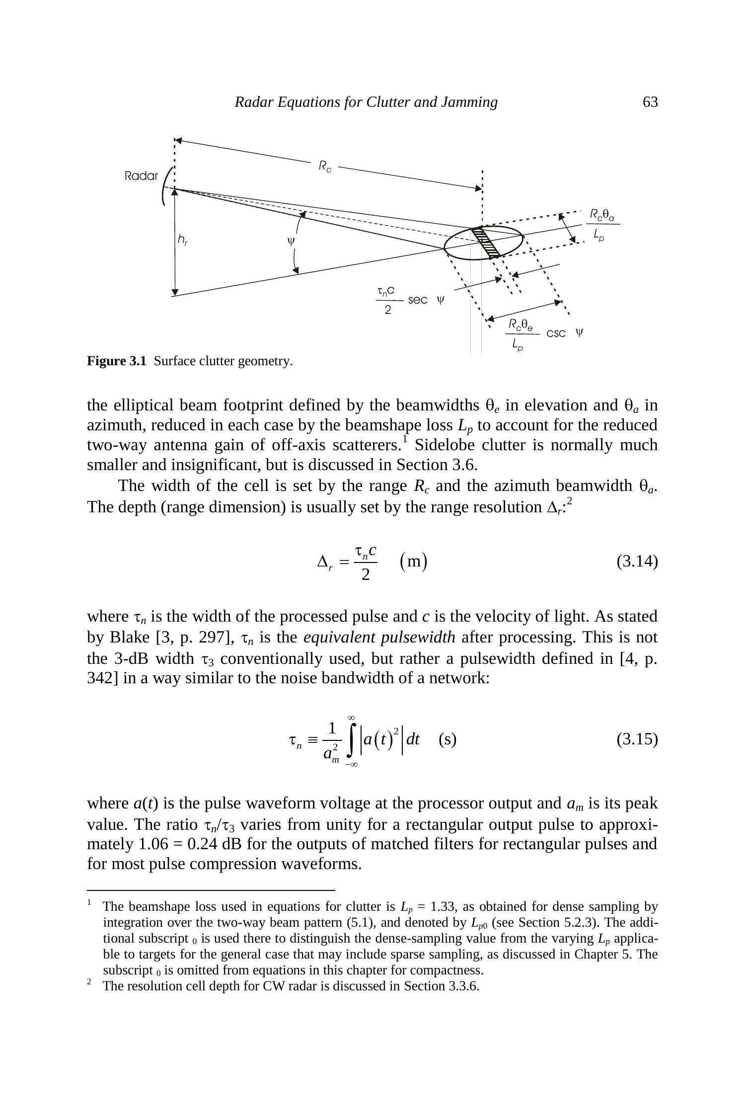 杂波单元位于由俯仰波束宽度 \(\theta_{e}\) 和方位波束宽度 \(\theta_{a}\) 确定的椭圆形波束落区内;为计及离轴散射体的双程天线增益降低,每一方向上均以波束形状损失 \(L_{p}\) 进行修正。\({ }^{1}\) 旁瓣杂波通常要小得多,可忽略不计,但将在3.6节讨论。