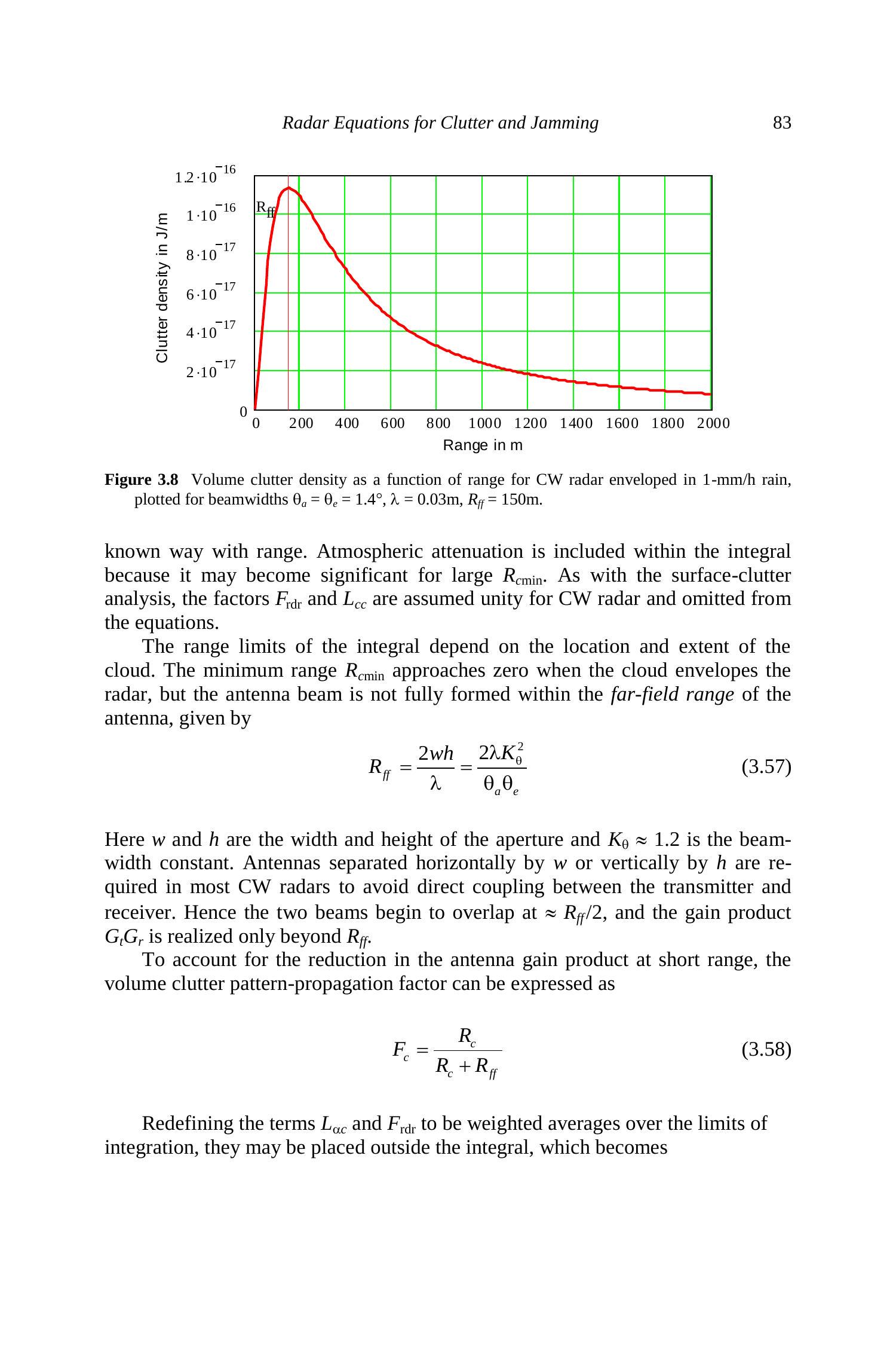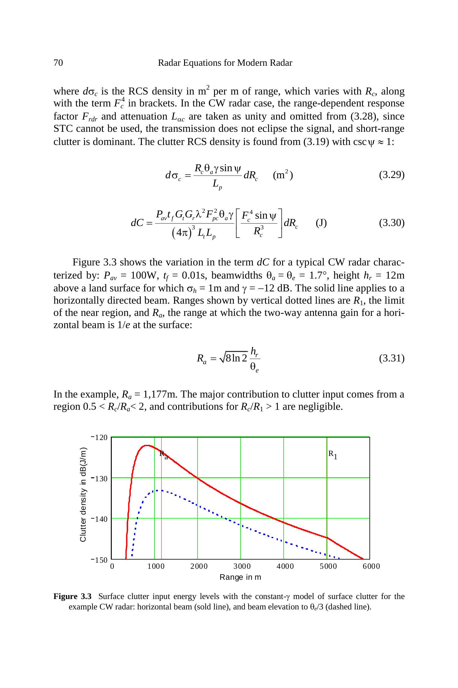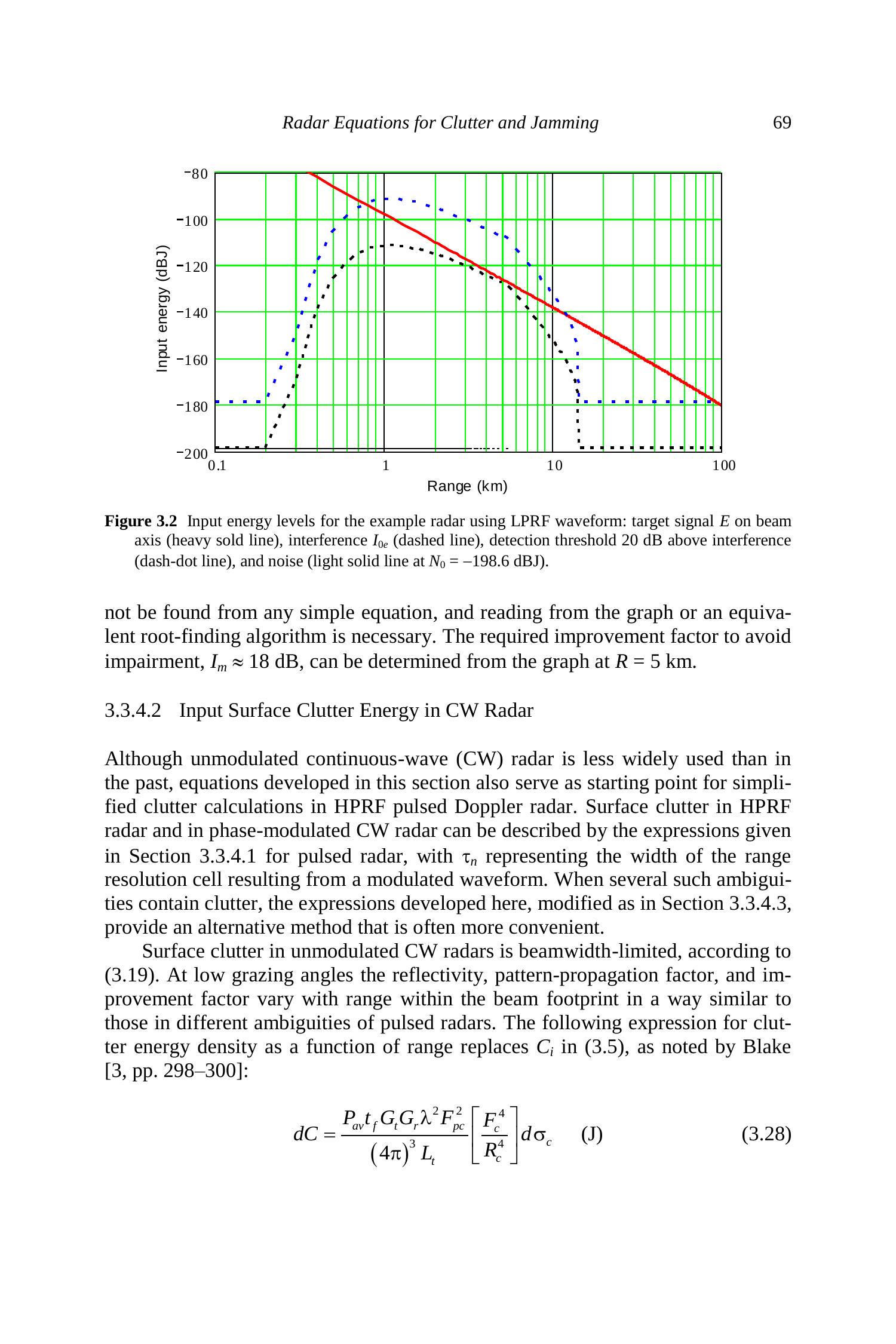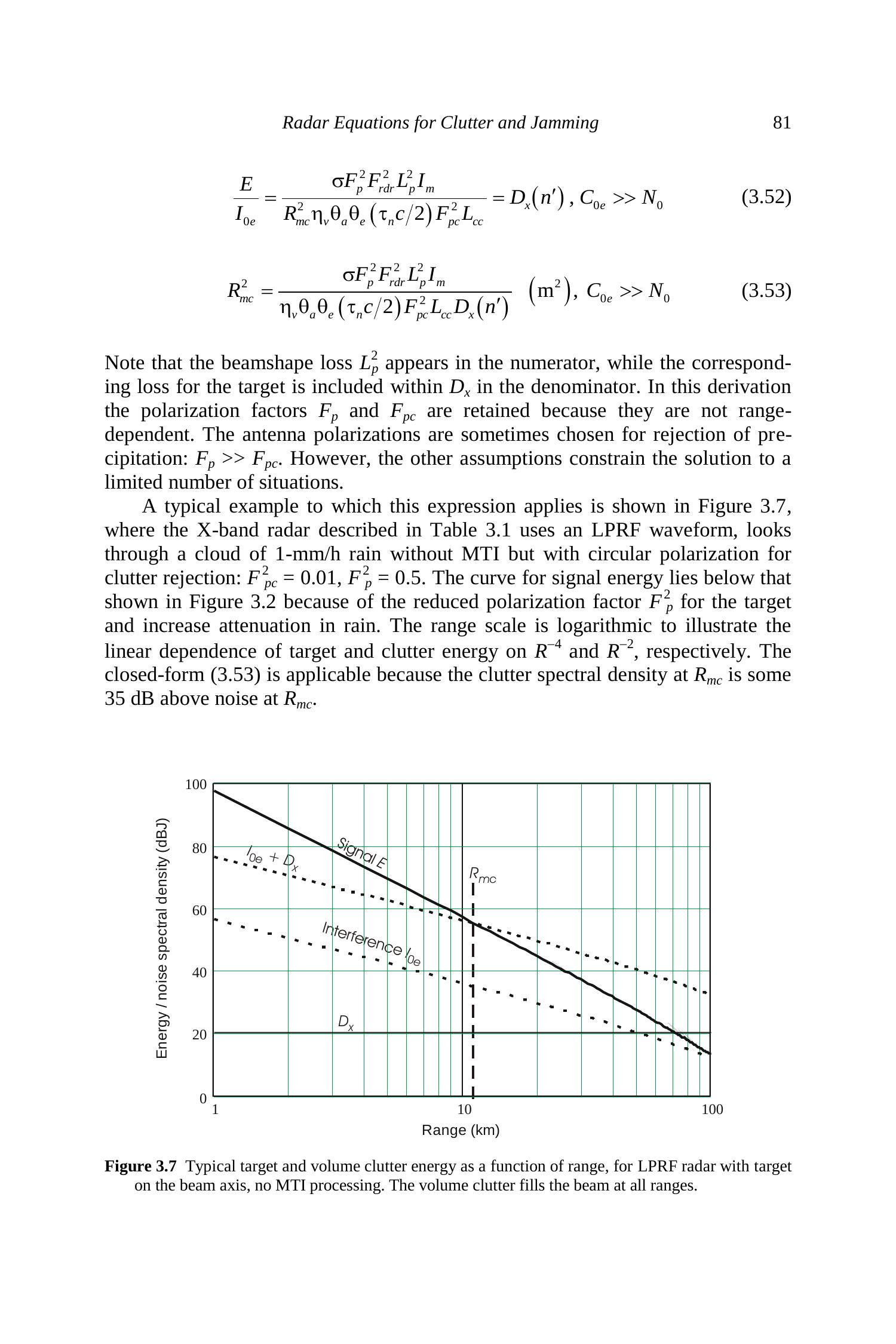 由公式 (3.11) 给出的有效杂波能量与噪声谱密度 \(N_{0}\) 相加,得到在杂波与噪声环境下的有效干扰能量 \(I_{0 e}\)。由此可得在杂波条件下的检测距离 \(R_{mc}\):