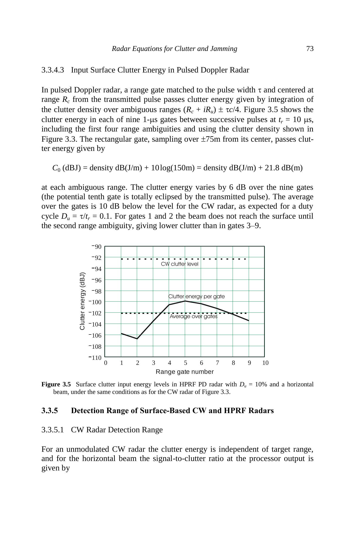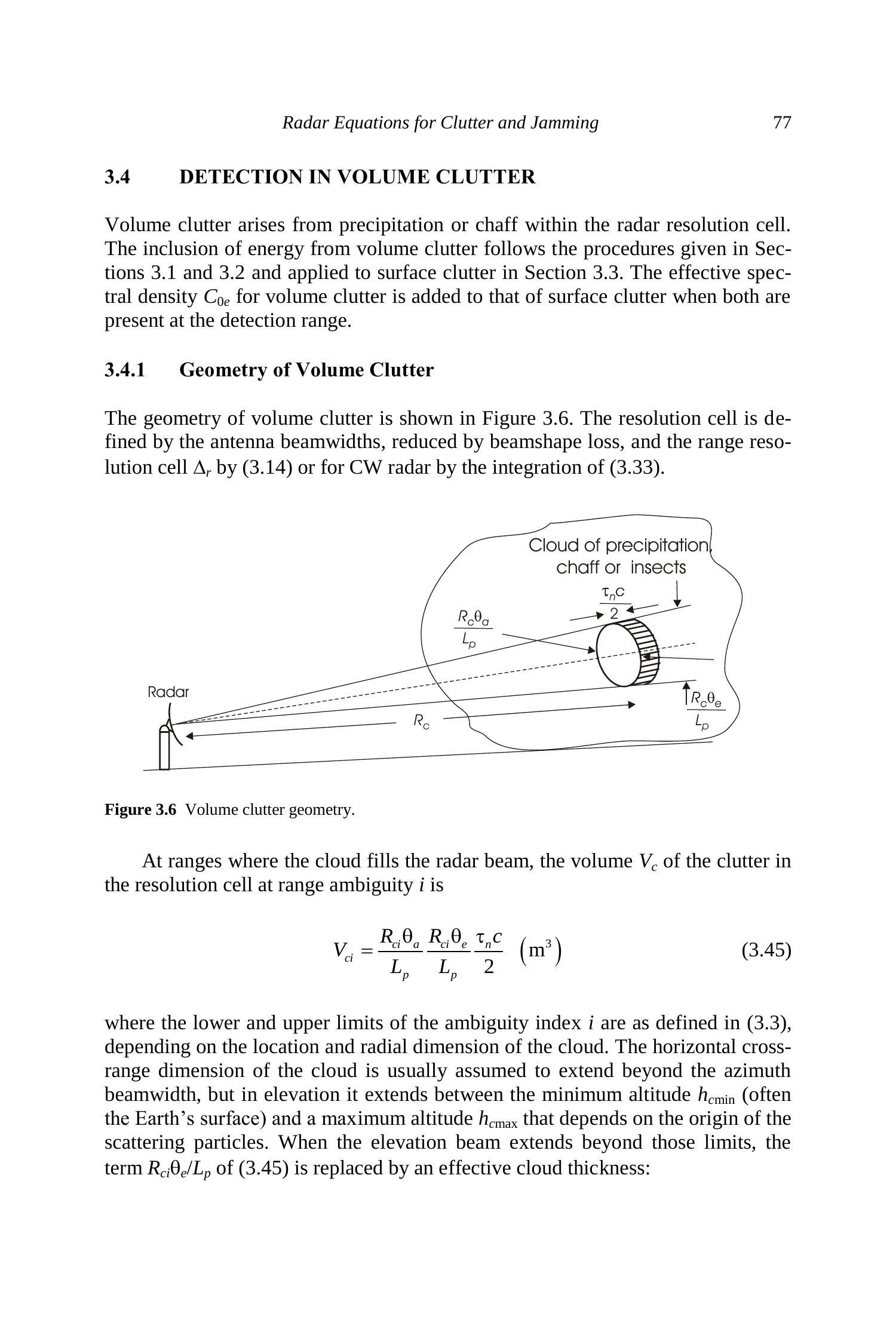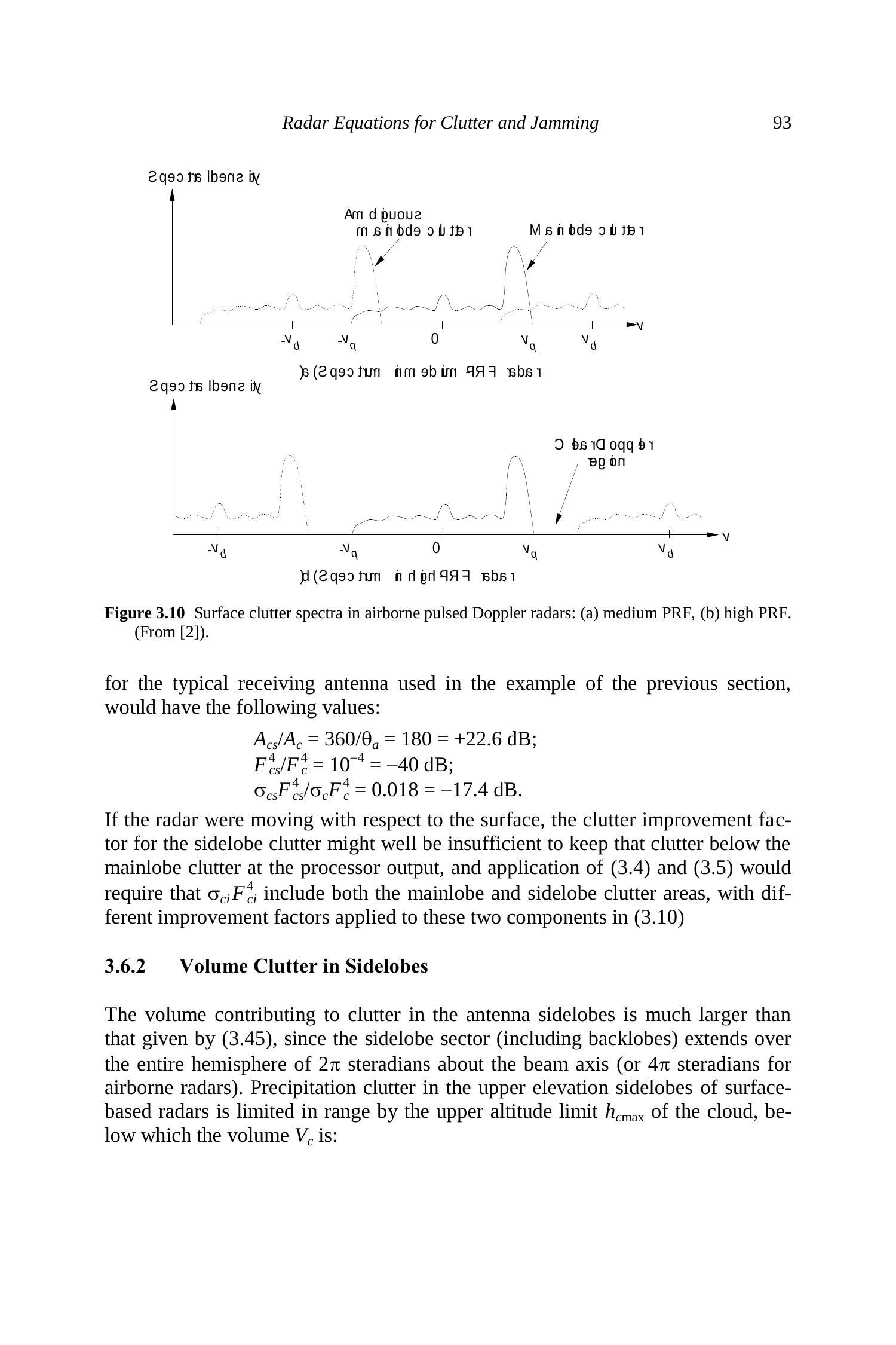 基于多普勒的信号处理可增加公式 (3.6) 中的独立样本数,该数取决于处理器输出的杂波频谱,从而相对于输入杂波减小 \(L_{cc}\)。第9章将介绍在使用多普勒处理的系统中计算 \(n_{c}\) 和 \(L_{cc}\) 的方法。对每个模糊区域,损失 \(L_{cc i}\) 将作为因子作用于有效谱密度。