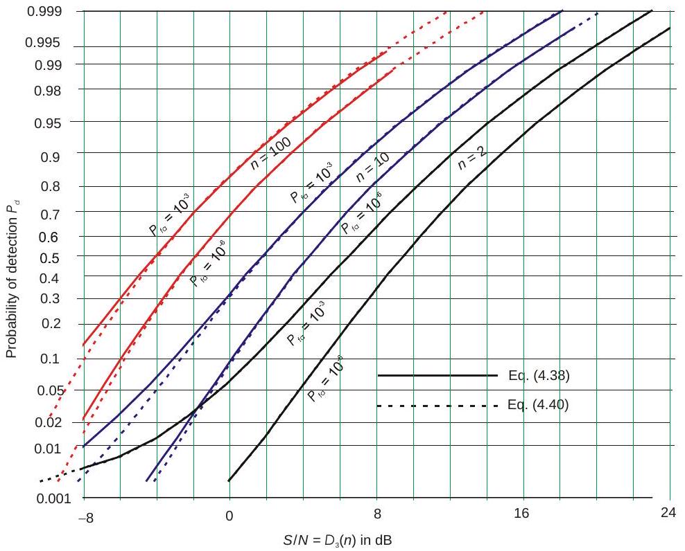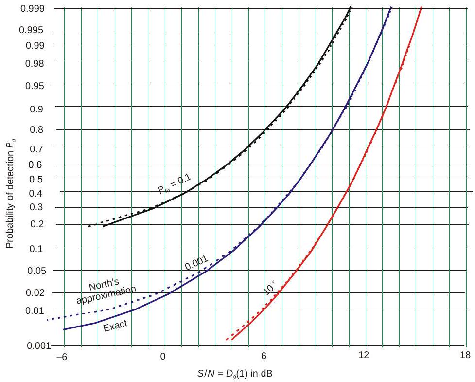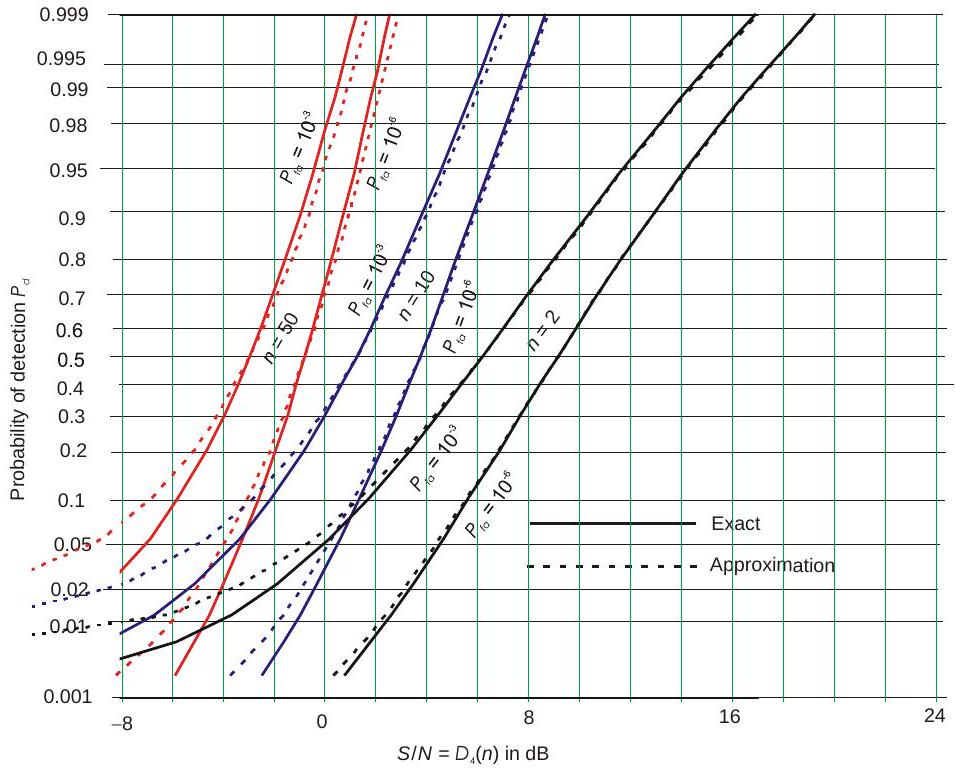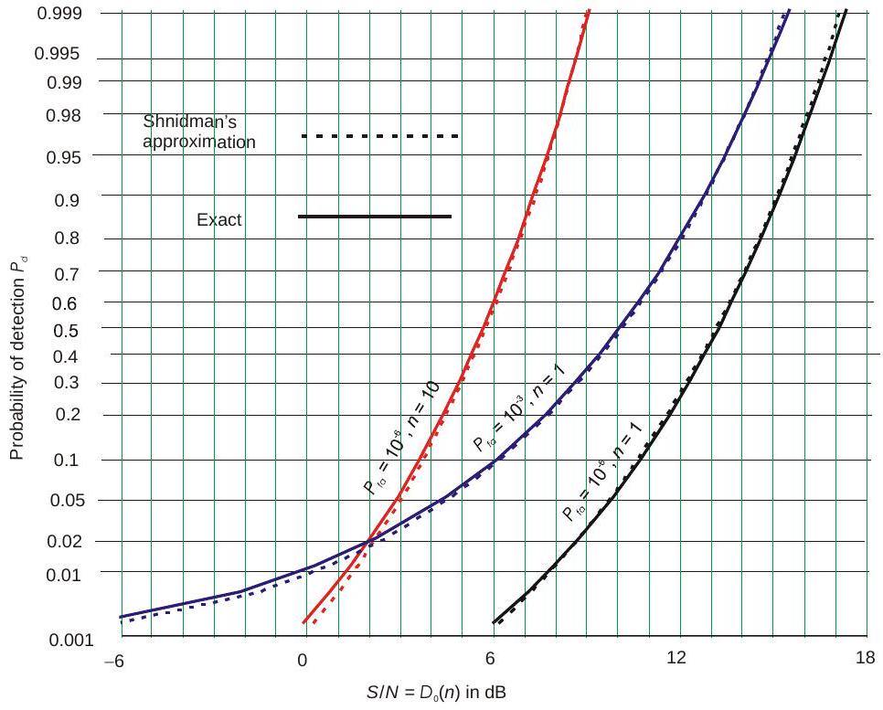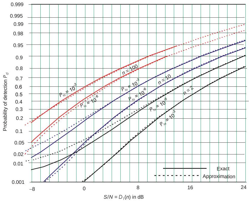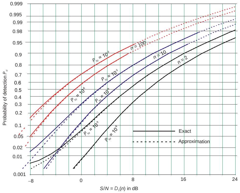 针对若干统计目标模型,已经发展出给出检测概率的精确方程。但这些方程形式复杂,需要数值积分或查特殊函数表。因此,大量雷达检测文献都致力于发展近似方法,以便快速计算给定信噪功率比 \(S / N\) 下的 \(P_{d}\),或反过来推算所需的 \(S / N\),而无需使用严格求解所需的复杂理论方程。许多图表(甚至整本书)已发表,用于展示在不同目标模型、特定虚警概率 \(P_{fa}\) 和脉冲数 \(n\) 下,\(P_{d}\) 随 \(S / N\) 的变化关系。这些图表有助于理解不同雷达和目标特性对检测性能的影响,但若要在雷达方程中使用,则更适合通过求解基本方程(精确或近似)得到数值结果。