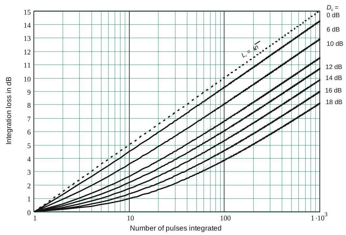 该增益始终处于 \(\sqrt{n} \leq G_{i} \leq n\) 的范围内。对于中等数量的 \(n\),其近似为 \(n^{0.8}\)(例如,当 \(n=10\) 时,\(L_{i}(n) \approx 2 \,\mathrm{dB}\)),条件是 \(P_{d}\) 与 \(P_{f a}\) 使得 \(D_{01} \geq 12 \,\mathrm{dB}\)。