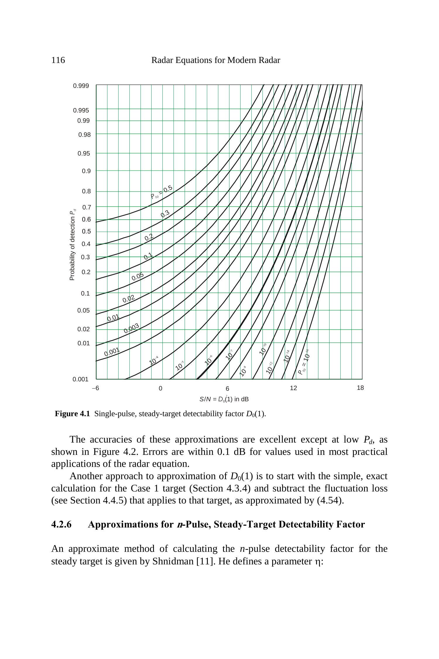 图 4.1 展示了 \(P_{d}\) 与 \(S/N\) 的关系曲线,该结果由 (4.1) 式在不同 \(P_{fa}\) 下的门限值计算得到。对于给定的 \(P_{fa}\),在任意所需 \(P_{d}\) 下,可直接从图 4.1 中读取 \(D_{0}(1)\),精度约为 \(\pm 0.1 \,\mathrm{dB}\);反之亦然。精确值可通过 (4.13) 的求根计算: