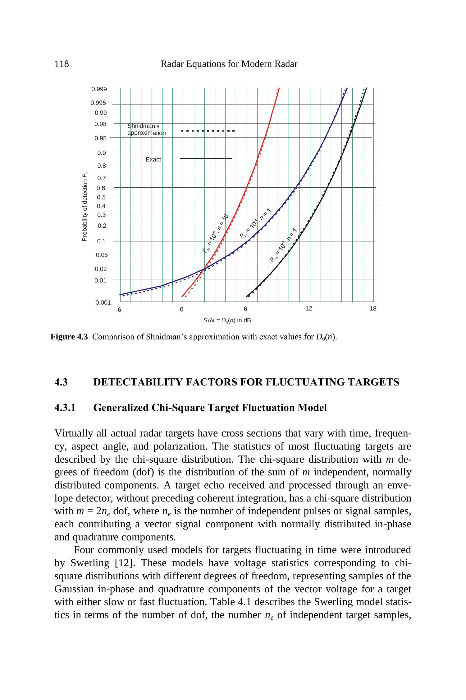 虽然表 4.1 描述了四种 Swerling 情形,但广义卡方分布的适用范围更广。对于具有分集的雷达,估算 \(n_{e}\) 的方法将在第 4.5 节中介绍。实际中常见 \(n_{e}\) 的整数值并不限于 \(1, 2, n, 2n\),还可能出现非整数值,这些情况均可通过文献 [13] 中提出的一般公式加以处理(见第 4.3.2 节)。