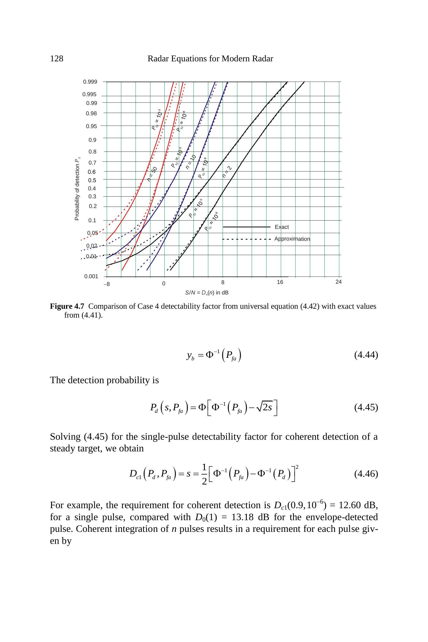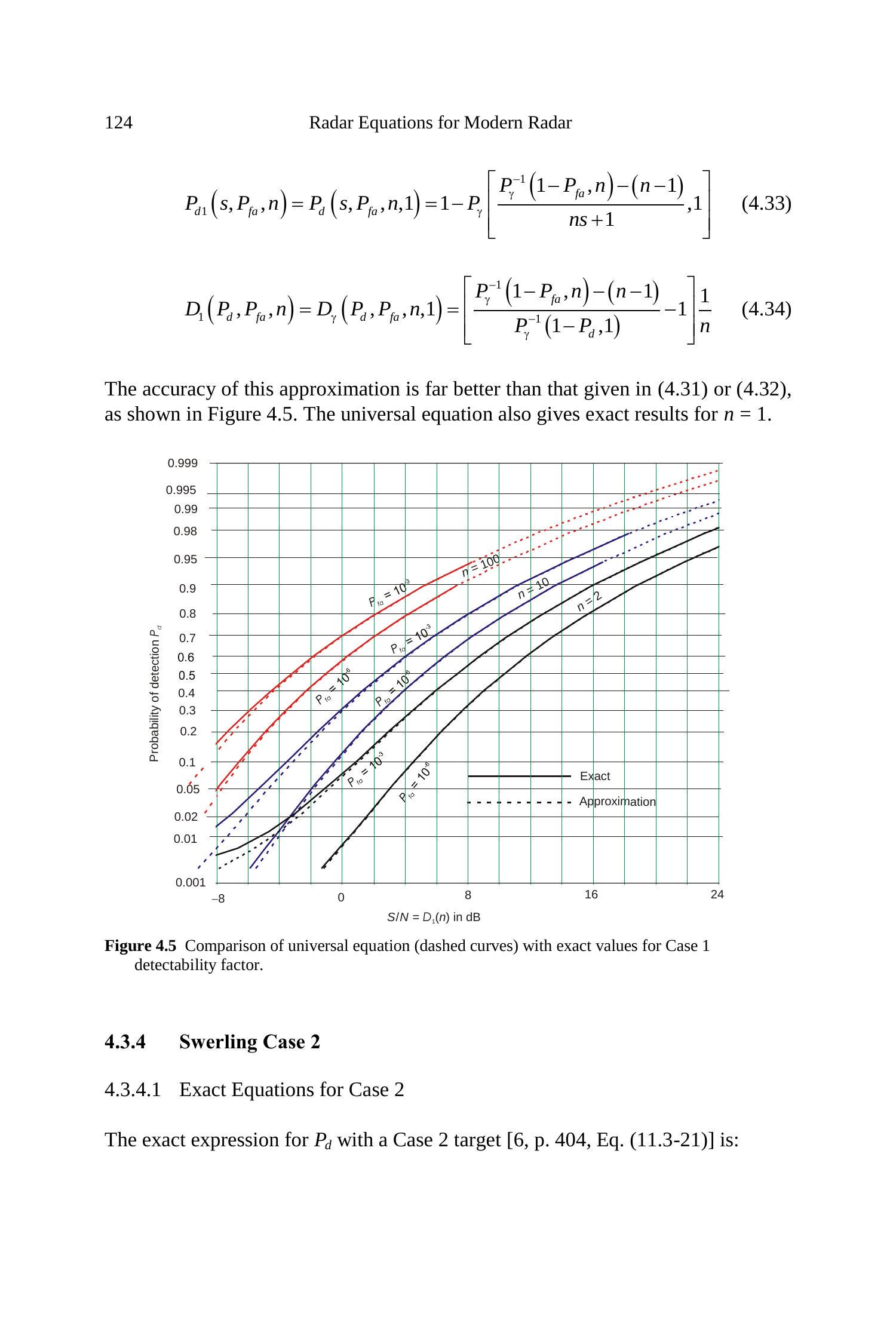 针对若干统计目标模型,已经发展出给出检测概率的精确方程。但这些方程形式复杂,需要数值积分或查特殊函数表。因此,大量雷达检测文献都致力于发展近似方法,以便快速计算给定信噪功率比 \(S / N\) 下的 \(P_{d}\),或反过来推算所需的 \(S / N\),而无需使用严格求解所需的复杂理论方程。许多图表(甚至整本书)已发表,用于展示在不同目标模型、特定虚警概率 \(P_{fa}\) 和脉冲数 \(n\) 下,\(P_{d}\) 随 \(S / N\) 的变化关系。这些图表有助于理解不同雷达和目标特性对检测性能的影响,但若要在雷达方程中使用,则更适合通过求解基本方程(精确或近似)得到数值结果。