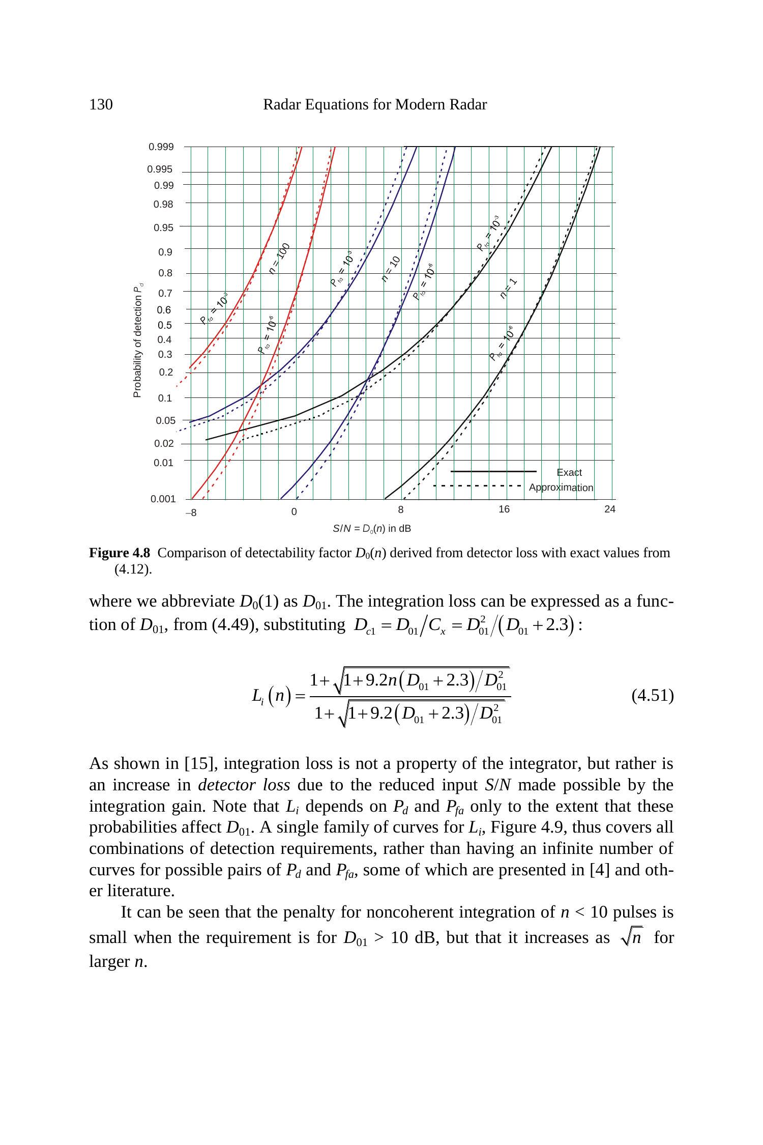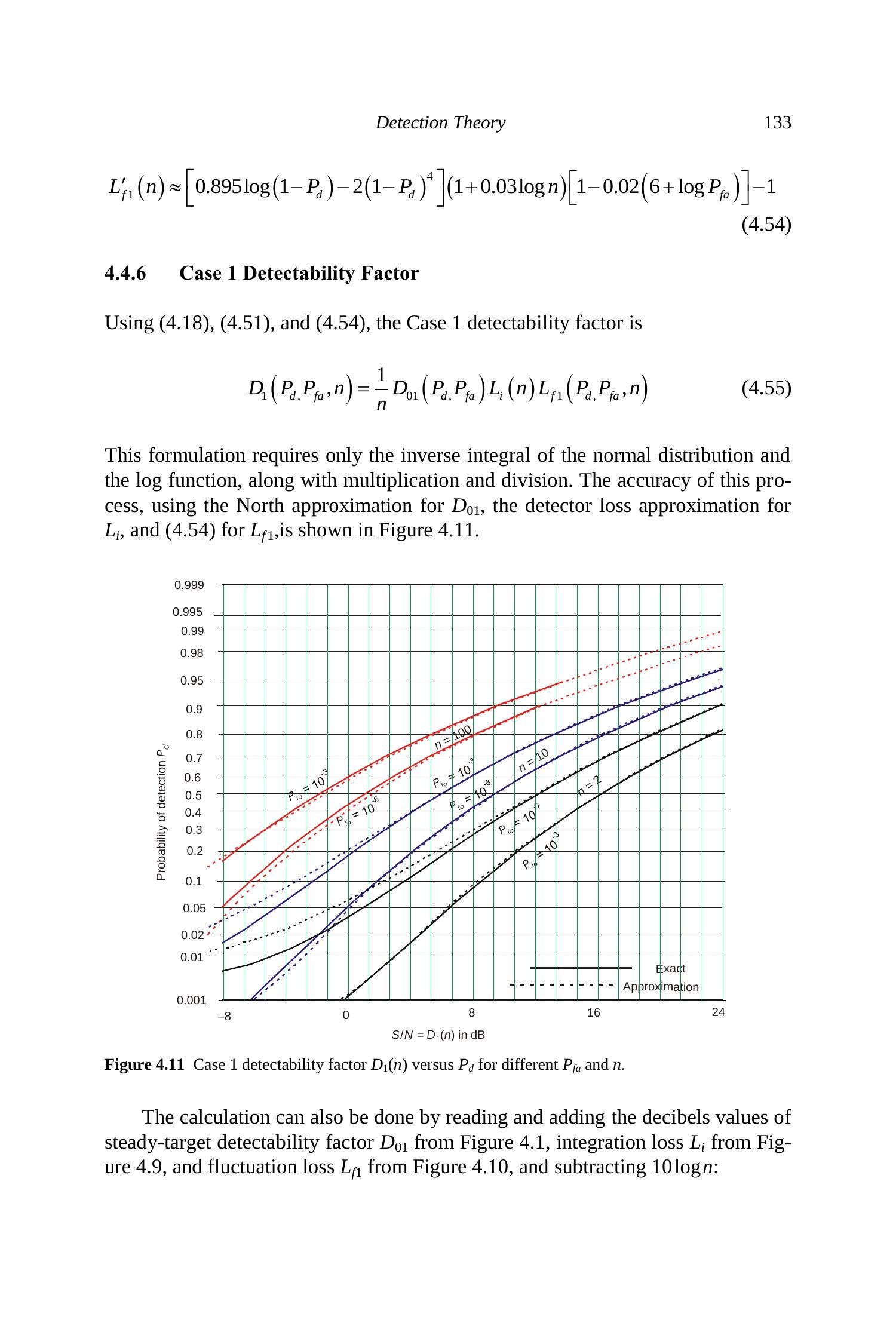另一种近似 \(D_{0}(n)\) 的方法是从 Case 1 目标(见第 4.3.3 节)的简单精确计算出发,叠加积分损耗(由式 (4.51) 近似),并减去该目标对应的起伏损耗(由式 (4.54) 近似)。