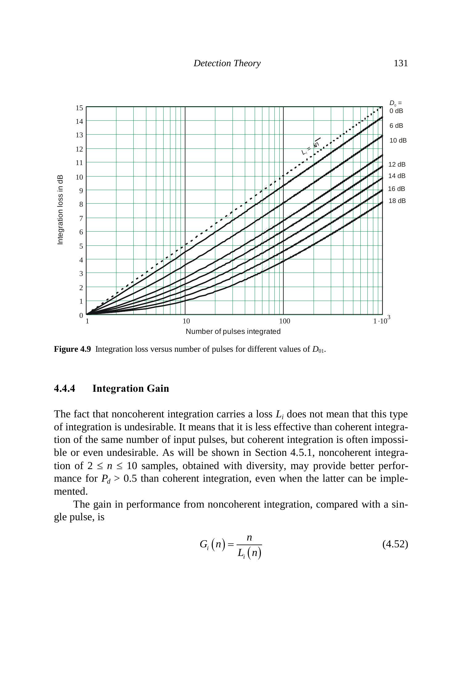 非相干积分存在损耗 \(L_{i}\) 并不意味着此类积分方式不可取。它仅表示在相同脉冲数下,非相干积分的效果不如相干积分。然而,相干积分往往是不可能的,甚至在某些情况下是不希望的。正如将在第 4.5.1 节中说明的,采用分集技术获得的 \(2 \leq n \leq 10\) 个样本进行非相干积分时,即使能够实现相干积分,其在 \(P_{d}>0.5\) 的条件下也可能表现出更优的性能。