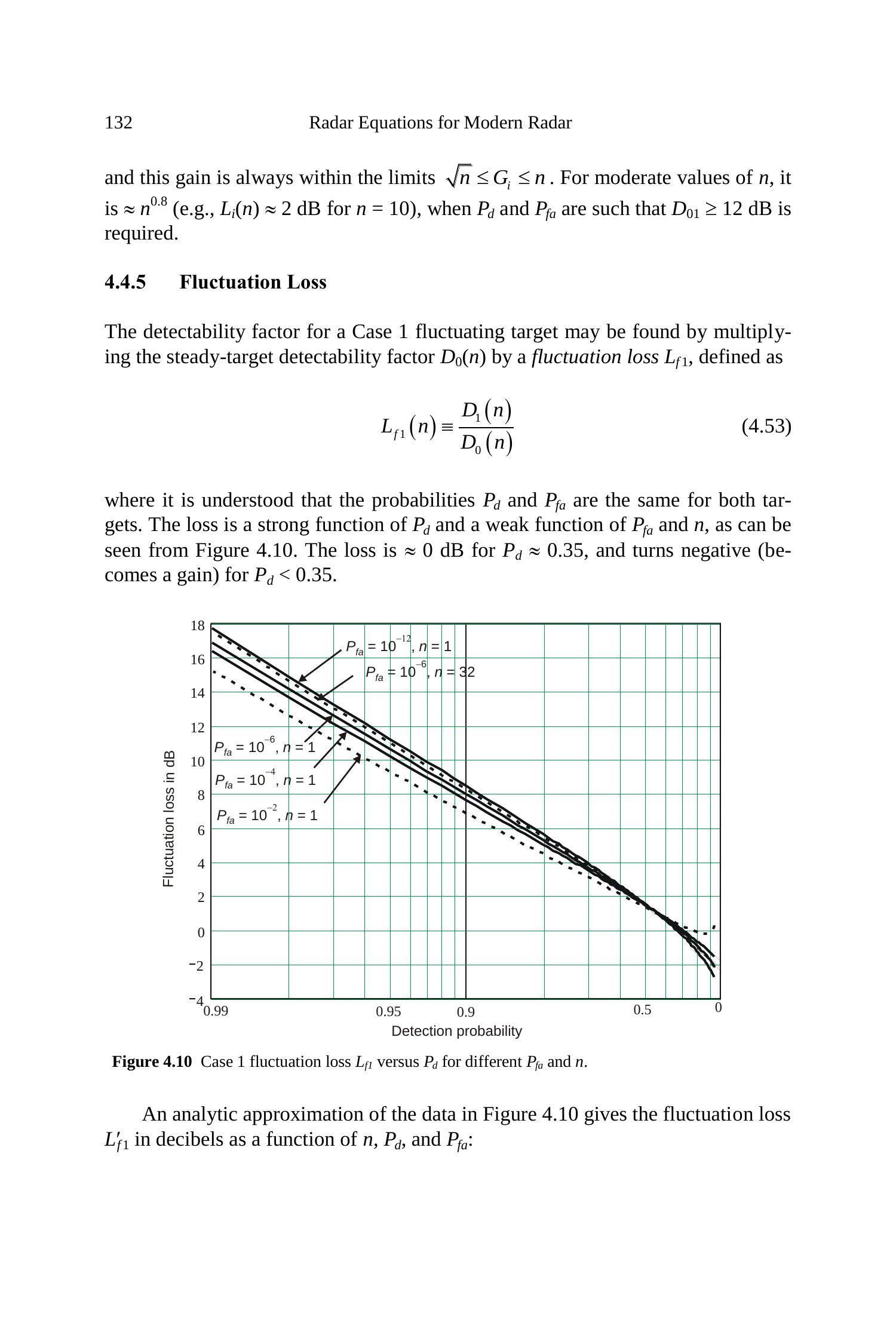 对图 4.10 数据的解析近似可得 \(L_{f 1}^{\prime}\)(以 dB 表示)作为 \(n, P_{d}, P_{f a}\) 的函数:
