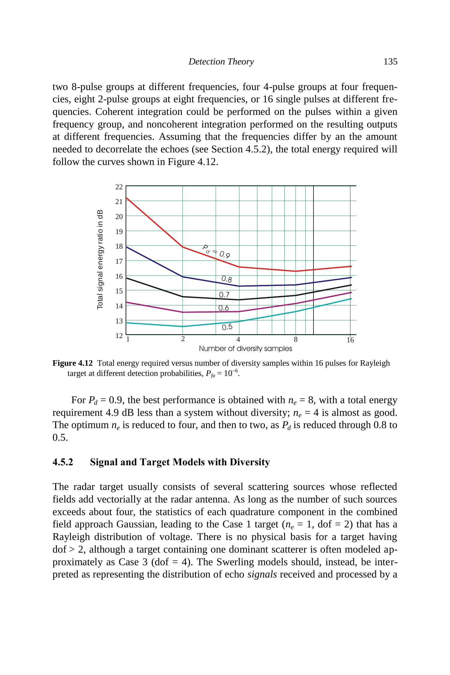 在每个频率子组内可以进行相干积分,而对不同频率组的输出再进行非相干积分。假设这些频率差异足够大以致回波去相关(见第 4.5.2 节),则所需总能量随分集样本数的变化如图 4.12 所示。