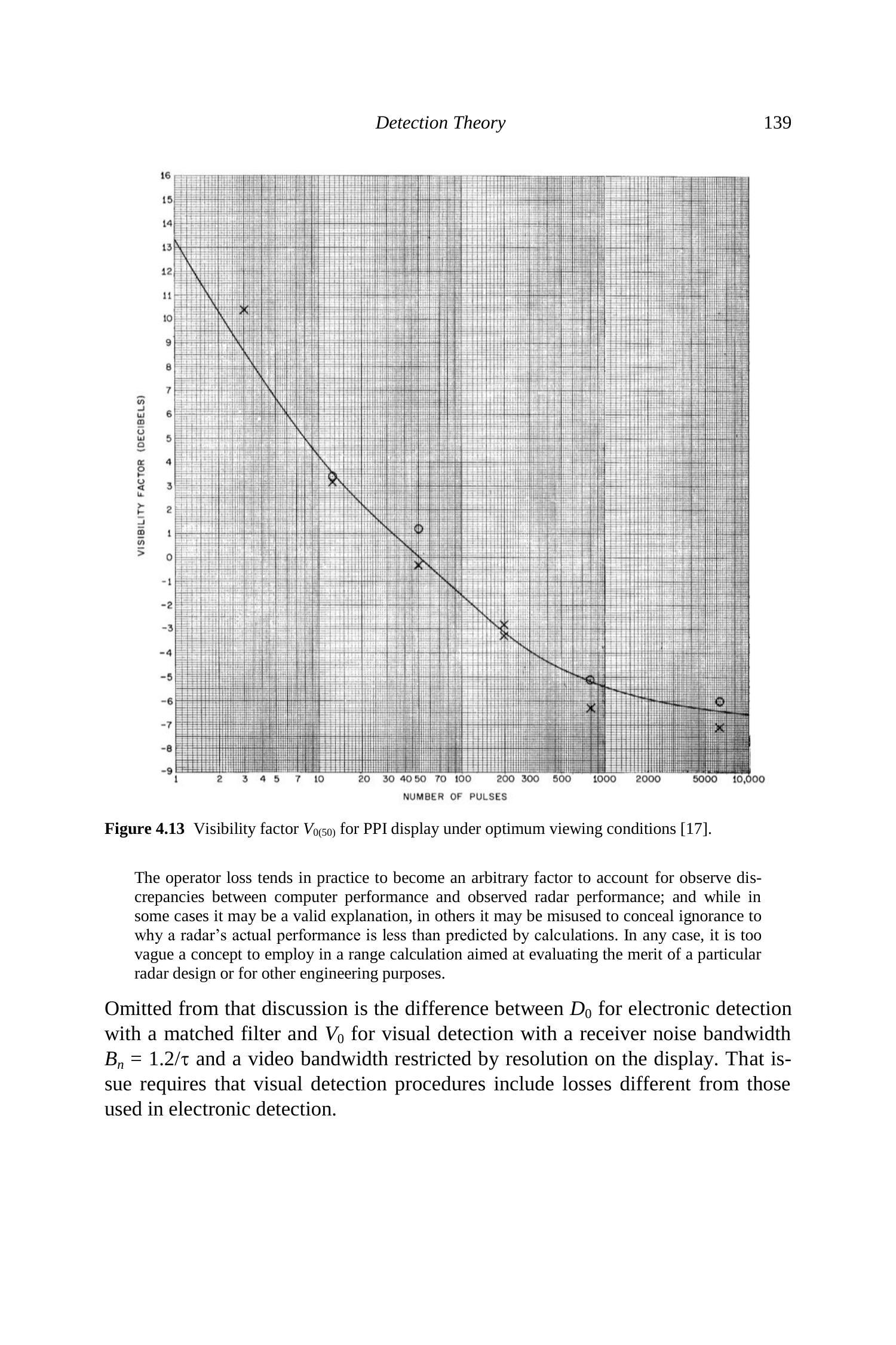 对于图 4.13 所代表的过程,无法确定其虚警概率。典型的 PPI 显示大约包含 \(10^{5}\) 个雷达分辨单元,并在约 \(10\) 秒的扫描周期内呈现数据。因此,如果该过程中每次扫描产生一次虚警,则可假定 \(P_{f a}=10^{-6}\)。比较单脉冲条件下 \(V_{0(50)}=13.2 \mathrm{~dB}\) 与稳定目标在 \(P_{d}=50 \%, P_{f a}=10^{-6}\) 时的可检测因子 \(D_{0}=11.2 \mathrm{~dB}\),可以看出,与匹配滤波器单通道输出的电子检测相比,视觉检测过程会产生约 \(2 \mathrm{~dB}\) 的损失。公式 (1.16) 中出现的带宽修正因子 \(C_{b}\) 是在此 \(2 \mathrm{~dB}\) 损失之外的,因此即便 \(C_{b}=0 \mathrm{~dB}\),相对于匹配滤波器电子检测,性能仍会下降 \(2 \mathrm{~dB}\)。