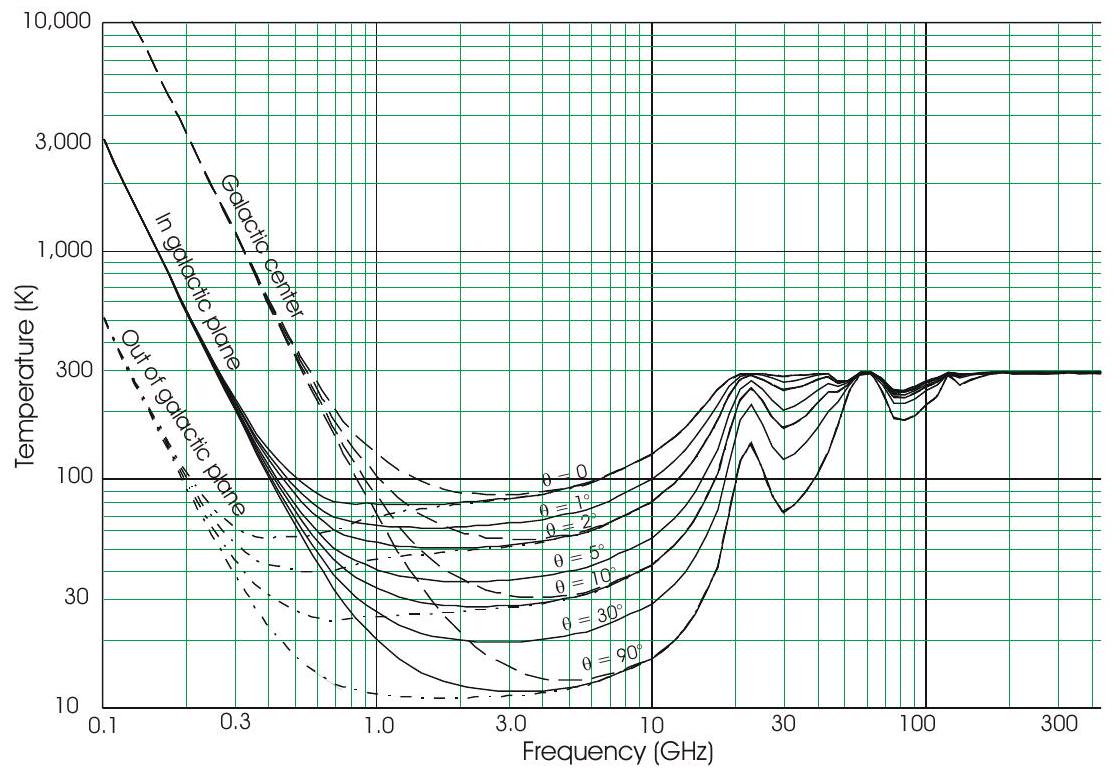 由于波束轴相对于银河平面和中心的角度难以预测,雷达分析通常采用主瓣方向的 \(T_{0.1 \text{ mid}}=3,050 \,\mathrm{K}\)。若要得到保守估计,可以代入最大值。但无论如何,银河噪声对微波雷达最终系统噪声温度的贡献都可以忽略,例如在 S 波段下其贡献小于 10 K。