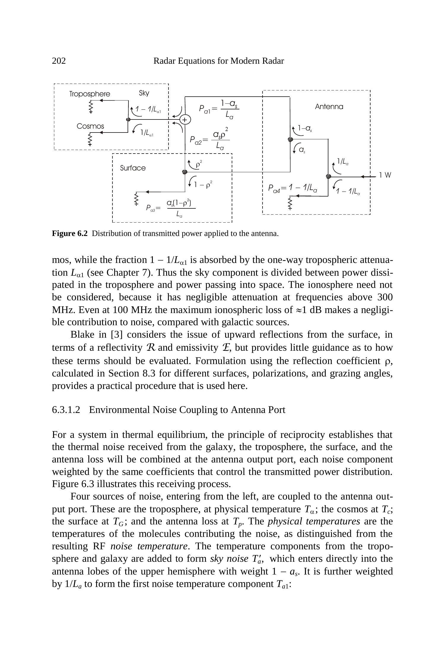 在热平衡系统中,互易性原理表明:来自银河系、对流层、地表以及天线自身损耗的热噪声将在天线输出端口叠加,每个噪声分量的加权系数与发射功率分布时的加权系数相同。图 6.3 展示了这种接收过程。